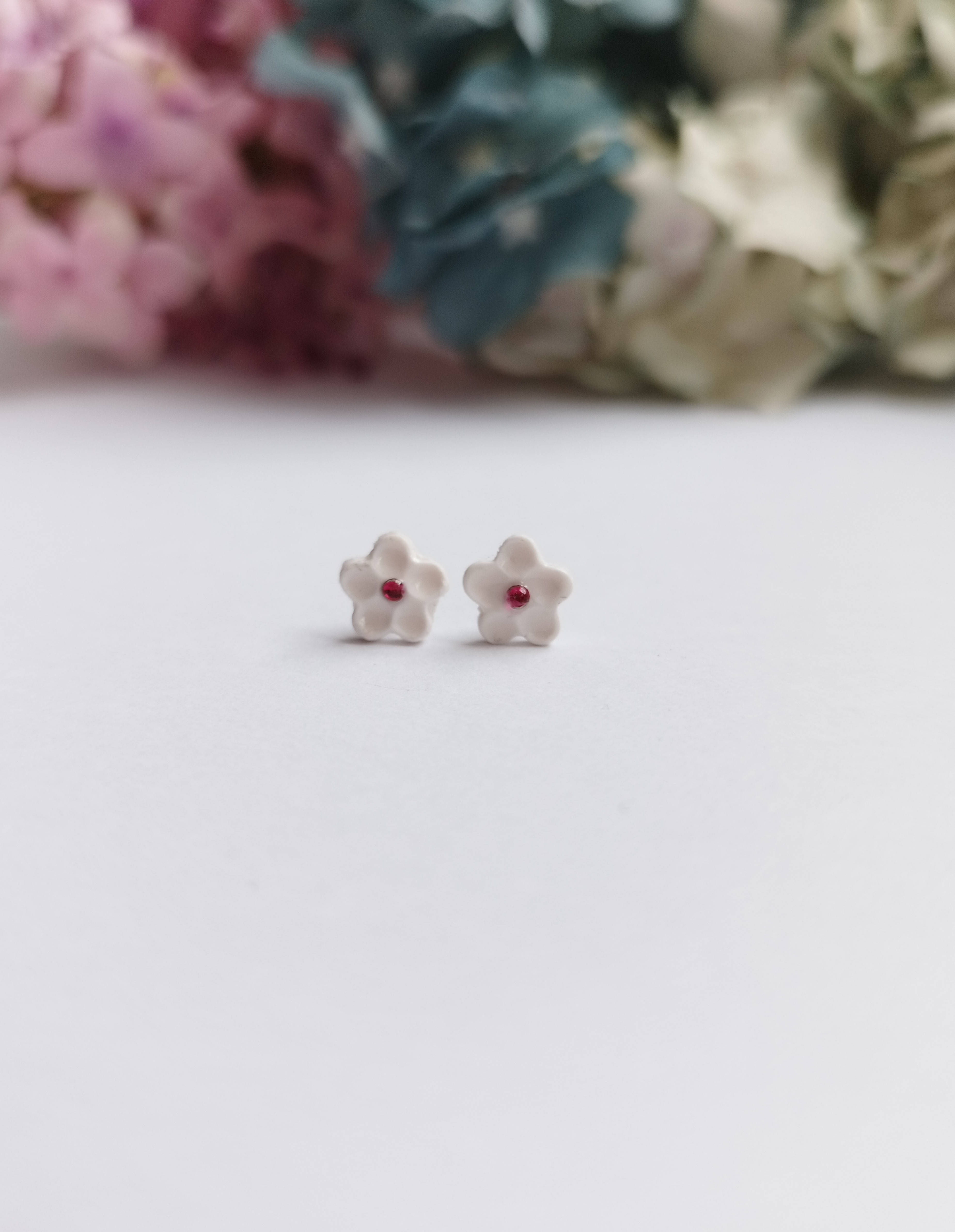 Velmi drobná bílá mini květinka na puzetě z chirurgické oceli. Květ je vyrobený z polymerové hmoty, dozdoben tmavě růžovým křišťálem a je lehce natřený křišťálovou pryskyřicí. Velikost květu je cca 0,8 cm. Nevhodné pro děti do 3 let nebo pod dohledem rodičů.