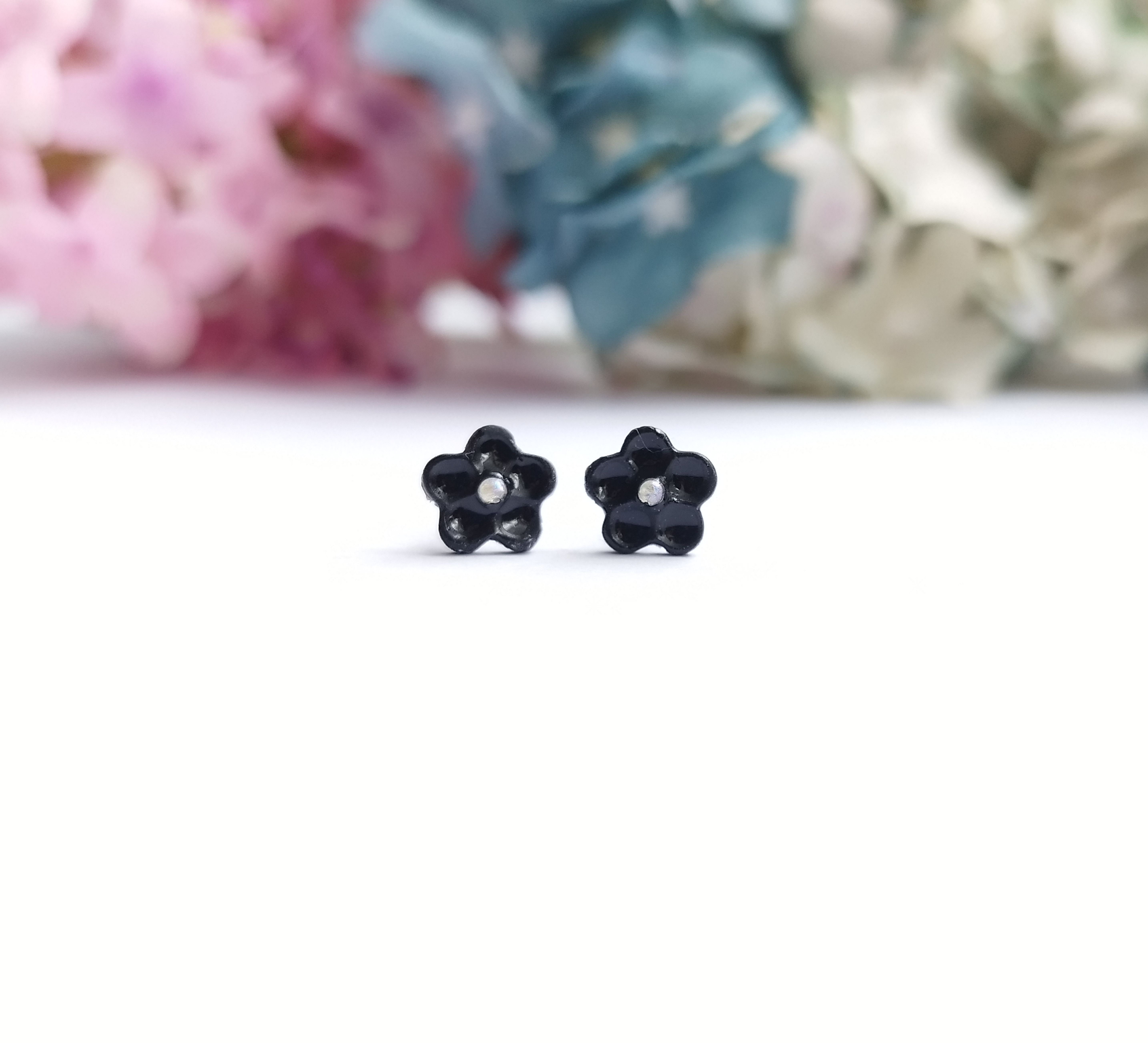 Velmi drobná černá mini květinka na puzetě z chirurgické oceli. Květ je vyroben z polymerové hmoty, dozdoben čirým křišťálem a je lehce natřený křišťálovou pryskyřicí. Velikost květu je cca 0,8 cm. Nevhodné pro děti do 3 let nebo pod dohledem rodičů.