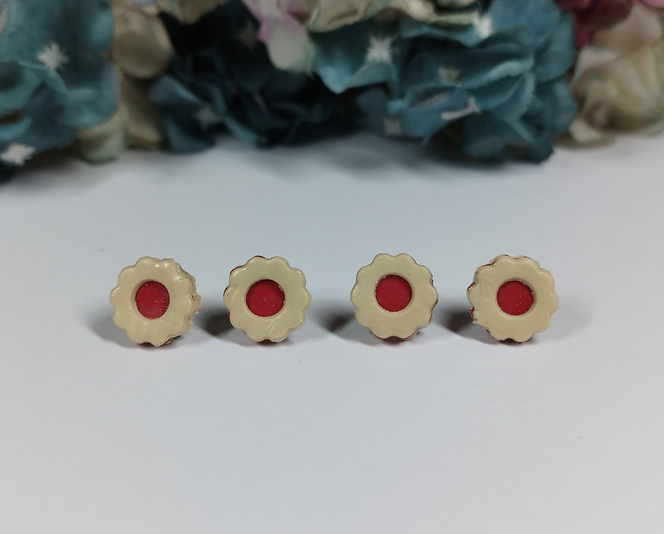 Naušnice v podobě lineckého cukroví ve tvaru květiny s výrazným červeným středem. Tento originální motiv je vyroben z polymerové hmoty a opatřen puzetou z chirigické oceli. Výrobek je přelakován speciálním pololesklým lakem. Naušnice je velká cca 1 cm. Nevhodné pro děti do 3 let nebo pod dohledem rodičů.