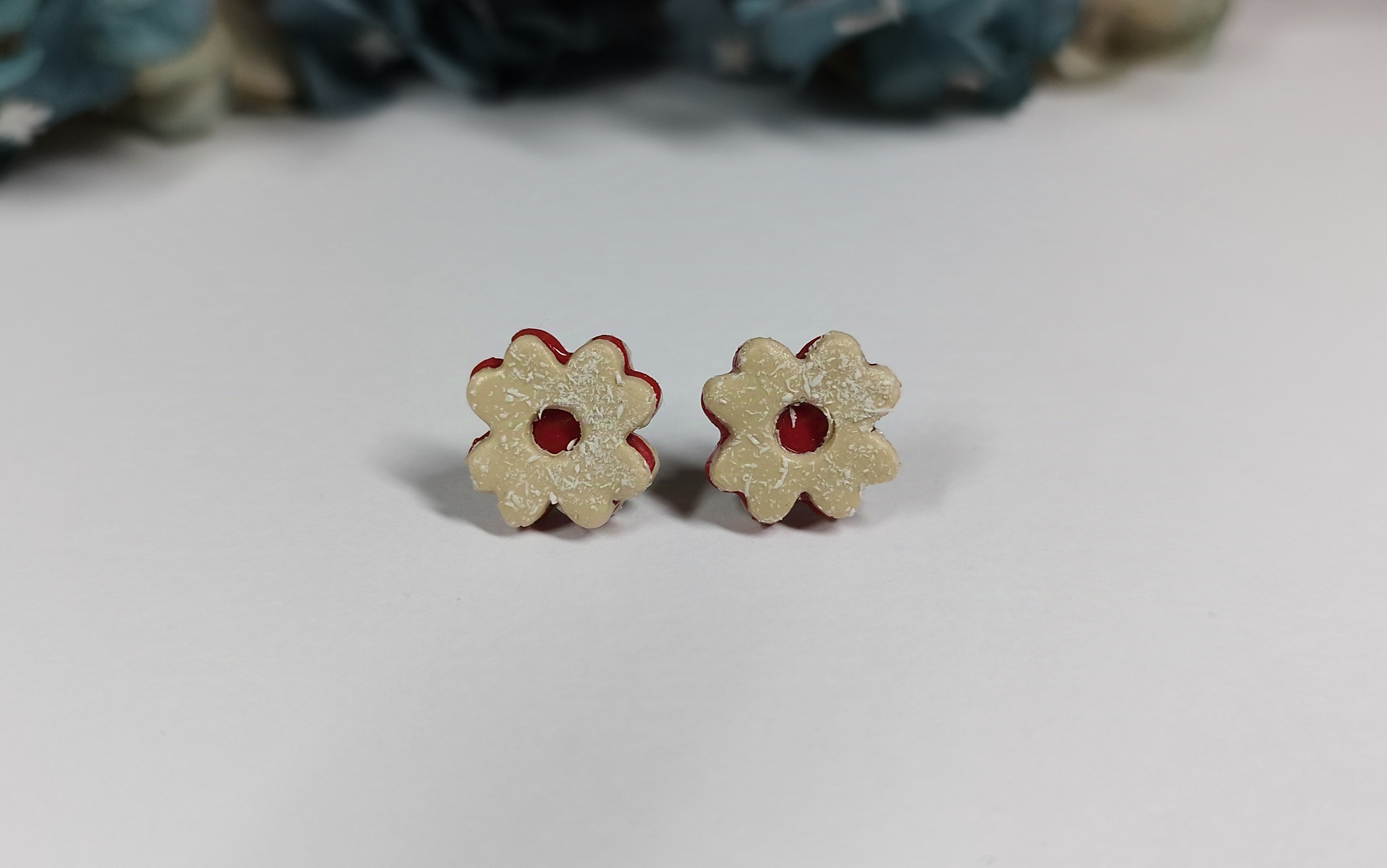 Naušnice v podobě lineckého cukroví ve tvaru květiny. Tento originální motiv je vyroben z polymerové hmoty a opatřen puzetou z chirigické oceli. Výrobek je přelakován speciálním pololesklým lakem. Naušnice je velká cca 1 cm. Nevhodné pro děti do 3 let nebo pod dohledem rodičů.  celý popis