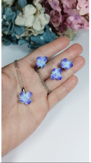 Sada modro-fialových hortenzií, která obsahuje oblíbené produkty - visací náušnice, náhrdelník a prten. Květy jsou vyrobené z polymerové hmoty a umístěné na komponenty z chirurgické oceli. Květiny jsou přetřené křišťálovou pryskyřicí, díky čemuž jsou lesklé a pevné. Vše je zabaleno v dárkové krabičce. Nevhodné pro děti do 3 let nebo pod dohledem rodičů.