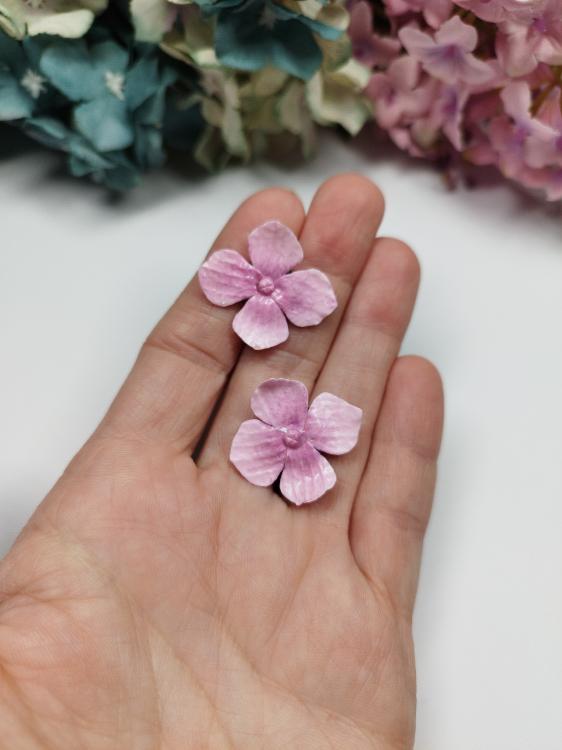Růžový květ hortenzie na puzetě z chirurgické oceli. Květ je propracovaně vyrobený z polymerové hmoty a je velký cca 2 cm. Květiny jsou přelakovány speciálním lakem, díky čemuž jsou odolnější. Nevhodné pro děti do 3 let nebo pod dohledem rodičů.
