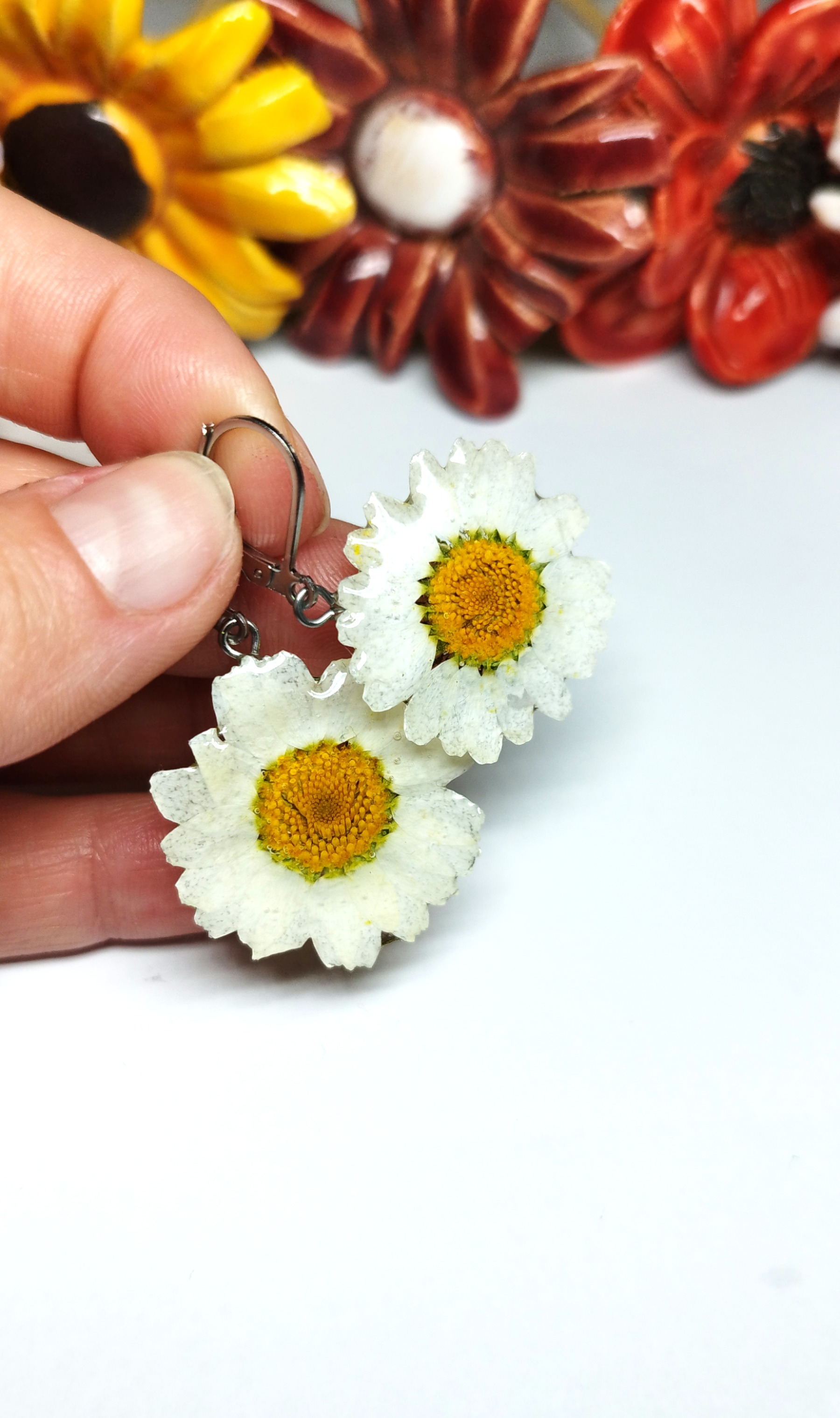 Květ pravé kopretiny zalitý v křišťálové pryskyřici Vás vtáhne do přírody. Květina je na zavírací náušnici z chirurgické oceli. Květ je velký cca 1,8 cm. Nevhodné pro děti do 3 let nebo pod dohledem rodičů.