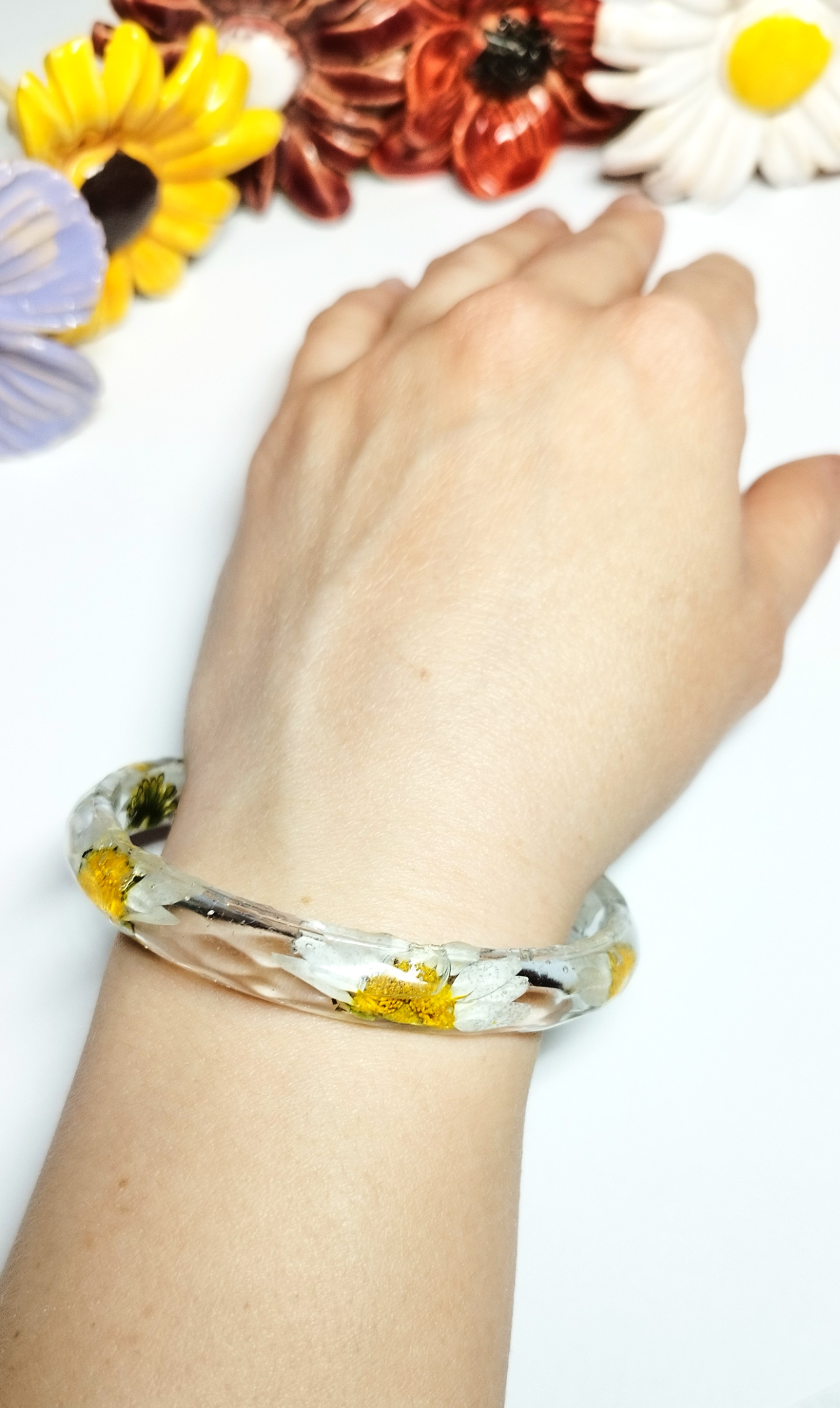 Úchvatný náramek z křišťálové pryskyřice, ve kterém jsou zalité sušené květy pravých kopretin. Nevhodné pro děti do 3 let nebo pod dohledem rodičů.