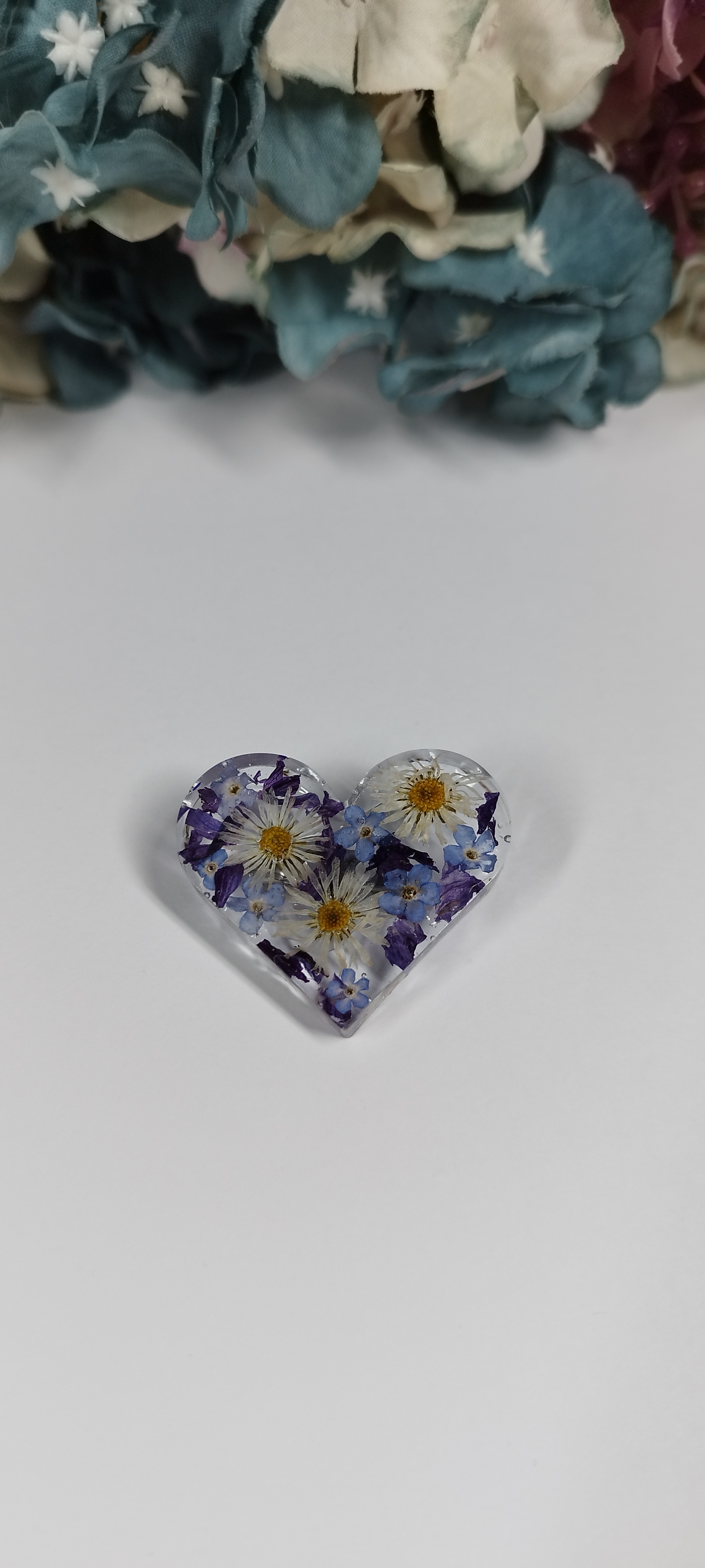Jedinečná květinová brož ve tvaru srdce s pravými květy, které jsou zalité v křišťálové pryskyřici. Jedná se o květy pomněnek, sedmikrásek a kousky chrpy. Brož je velká cca 2,5 cm a lze ji připevnit pomocí spínacího špendlíku z chirurgické oceli. Nevhodné pro děti do 3 let nebo pod dohledem rodičů.