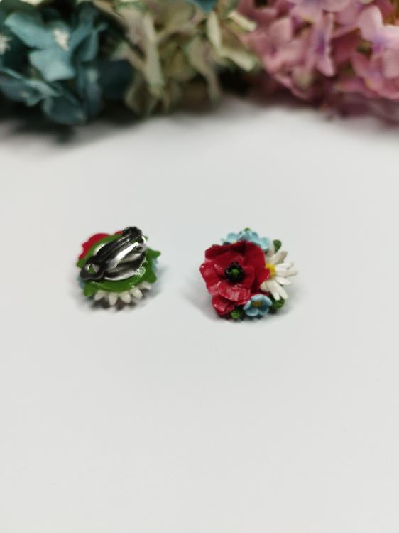Krásně barevná květinová náušnice s vlčím mákem, sedmikráskou a modrými pomněnkami. Květy jsou propracovaně vyrobené z polymerové hmoty. Náušnice je na zapínání pomocí klipsu z chirurgické oceli. Její velikost je cca 2 cm. Květiny jsou přetřené speciálním lakem, díky čemuž zůstanou pevné a odolné. Nevhodné pro děti do 3 let nebo pod dohledem rodičů.