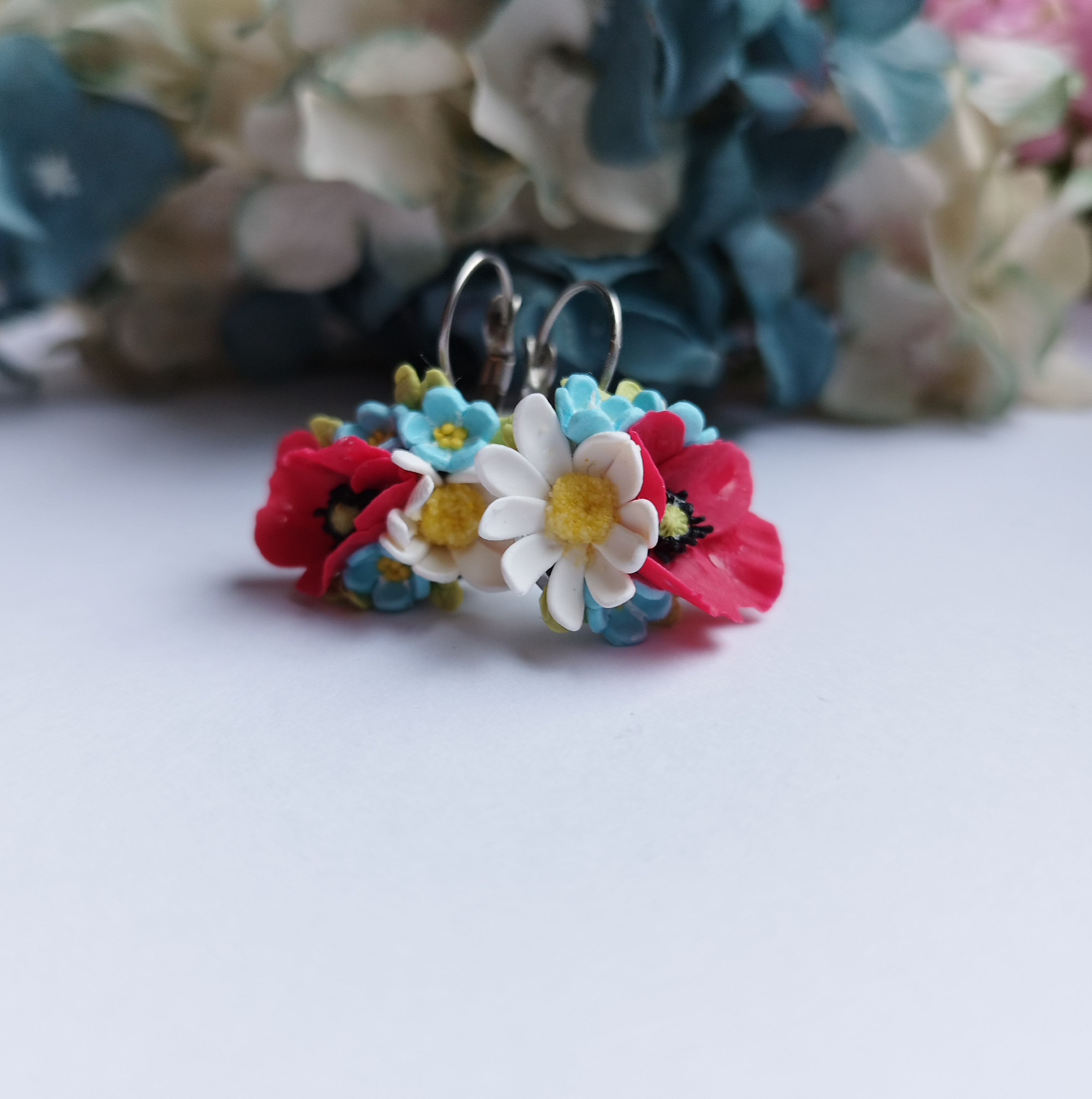 Krásně barevná květinová náušnice se sedmikráskou, vlčím mákem a pomněnkami. Květiny jsou vyrobené z polymerové hmoty, zadní strana je opatřena křišťálovou pryskyřicí. Díky tomu jsou květy pevné. Náušnice je visací se zavíráním z chirurgické oceli. Její velikost je cca 2 cm. Nevhodné pro děti do 3 let nebo pod dohledem rodičů.