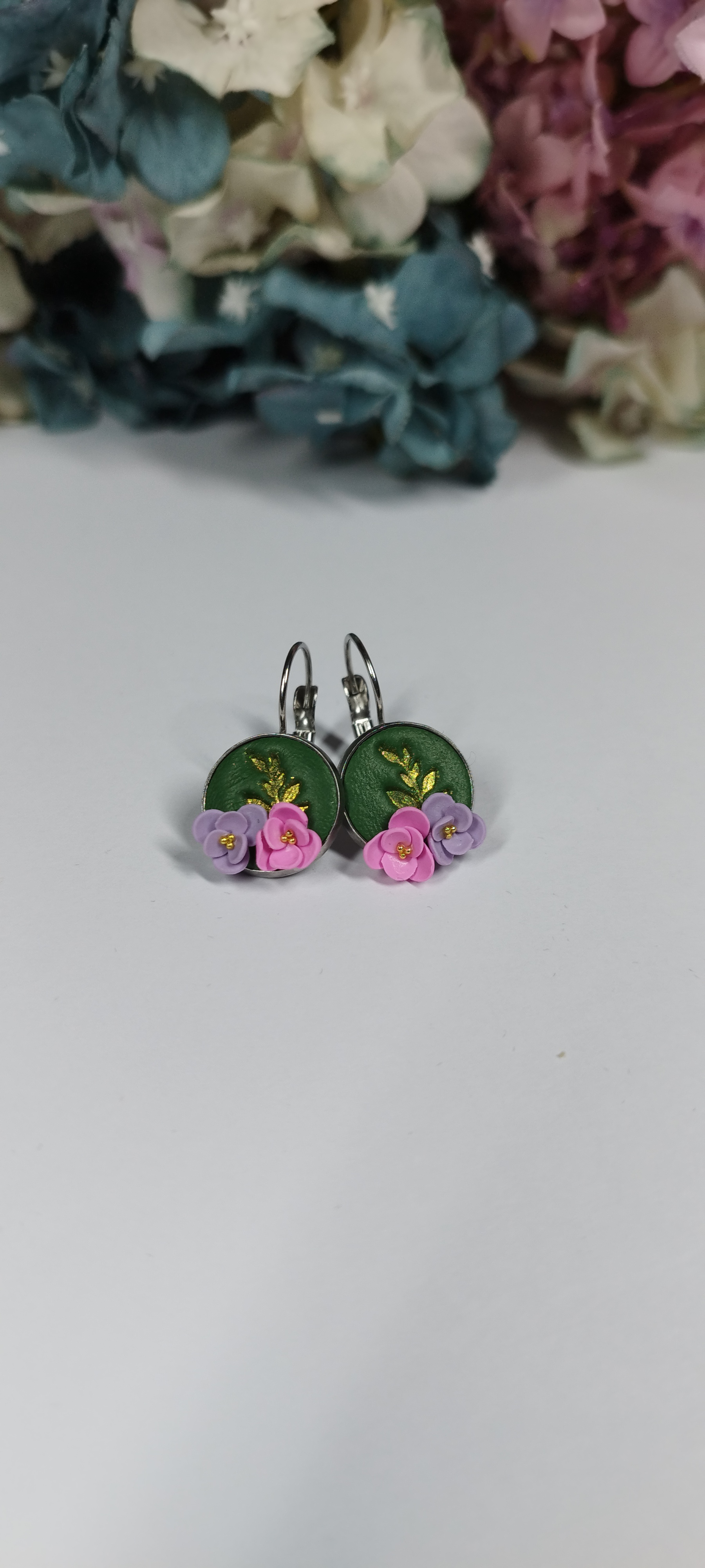 Okouzlující květinové náušnice se dvěma malými květy v růžové a filové barvě na zeleném podkladu. Květiny jsou vyrobené z polymerové hmoty a přidělané na zavírací náušnici z chirurgické oceli. Výrobek je přetřen speciálním lakem, díky čemuž zástane pevný a odolný. Velikost květů je i s podkladem cca 1,5 cm. Nevhodné pro děti do 3 let nebo pod dohledem rodičů.