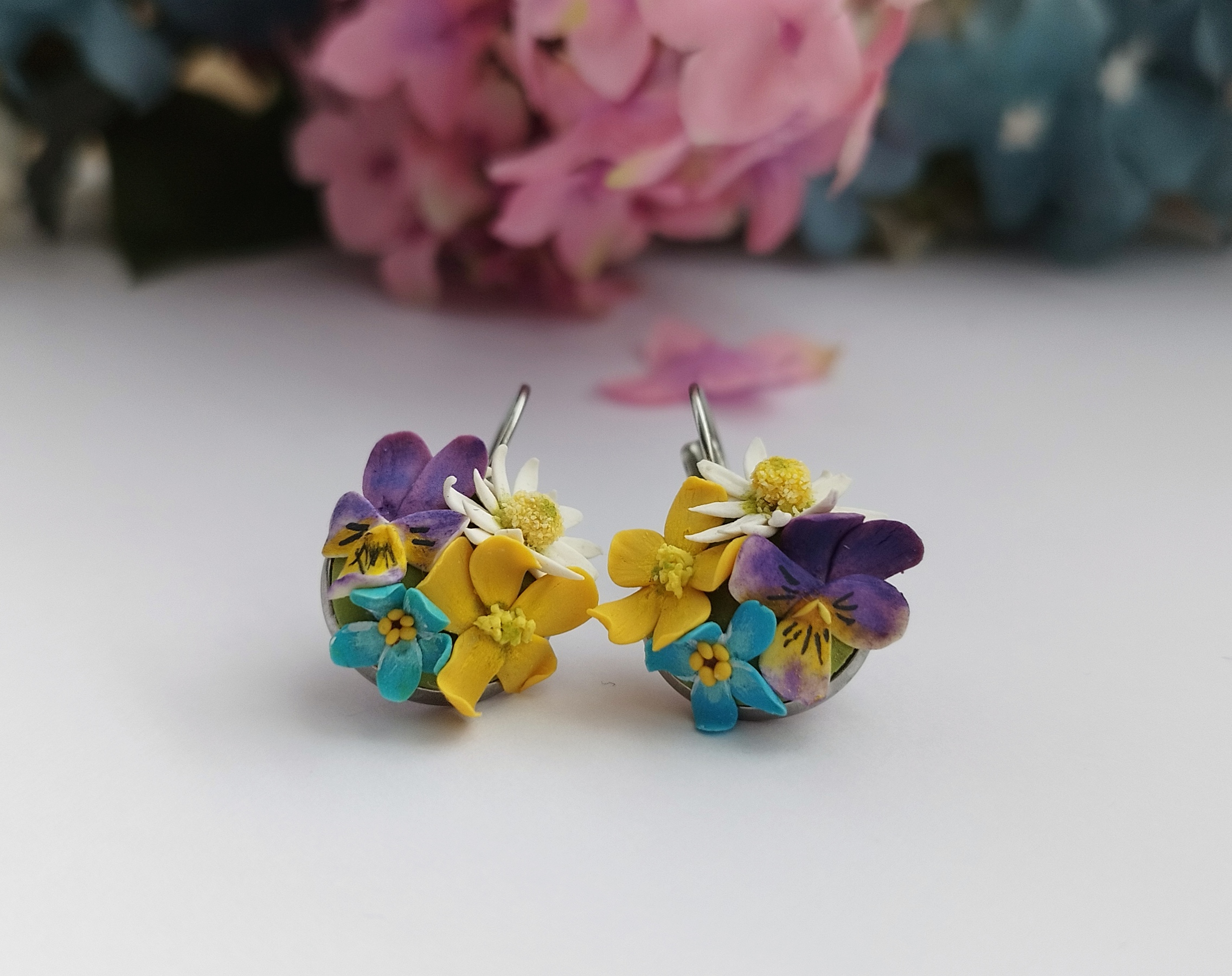 Visací náušnicový háček se sedmikráskou, violkou, pomněnkou a pryskyřníkem. Květiny vypadají skoro jako živé, ale nenechte se zmást! Jsou vyrobené z polymerové hmoty a přetřeny speciálním lakem, díky tomu je květ pevný a lesklý. Velikost náušnice je cca 2 cm. Nevhodné pro děti do 3 let nebo pod dohledem rodičů.
