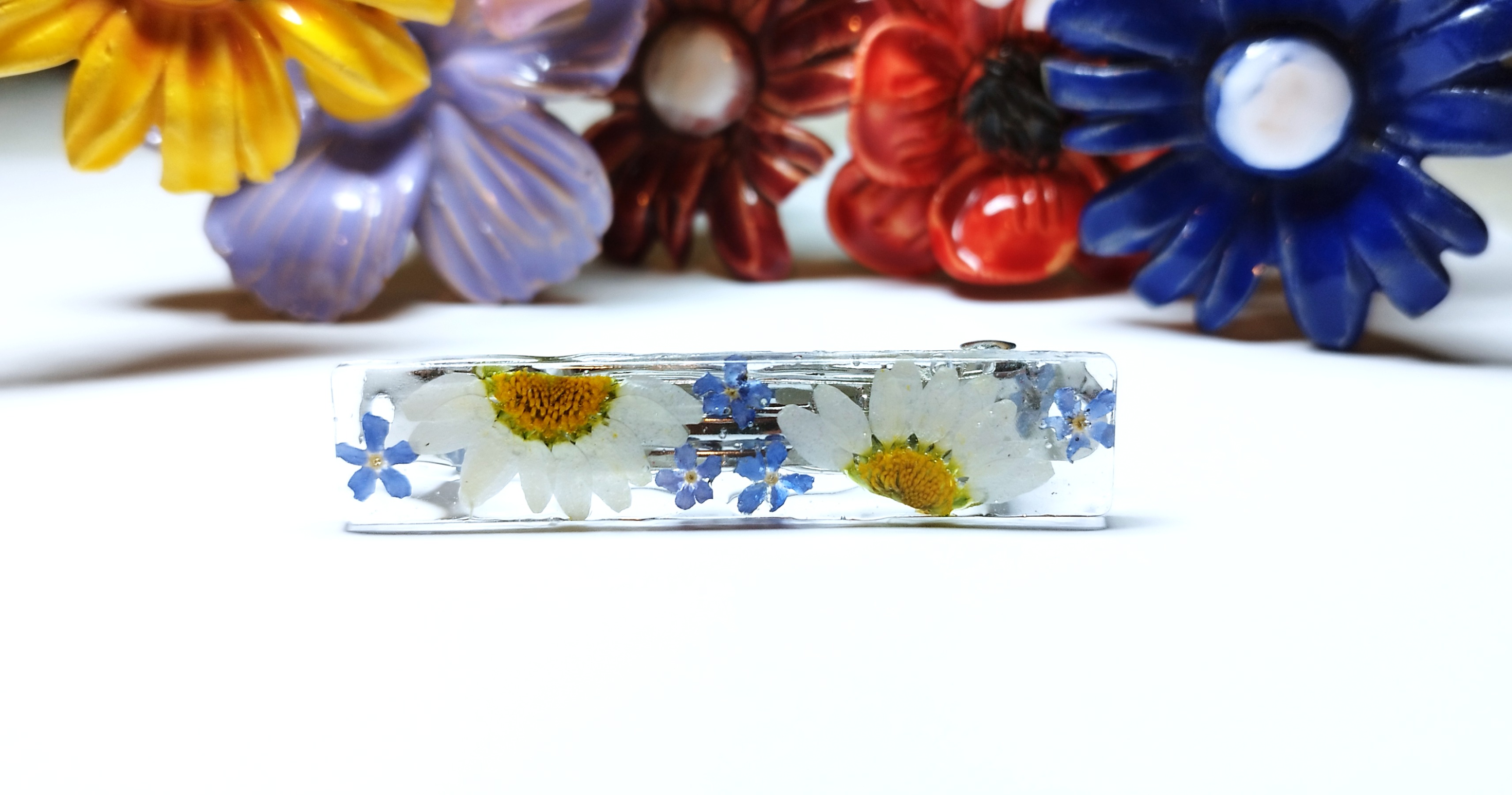 Okouzlující květinová spona do vlasů s pravými květy. Její propracovanost ihned upoutá Vaši pozornost. Skládá se ze sušených květů kopretin a modrých pomněnek, které jsou zalité v křišťálové pryskyřici. Francouzská spona do vlasů je ze slitiny oceli a její velikost je cca 8 cm. Nevhodné pro děti do 3 let nebo pod dohledem rodičů.