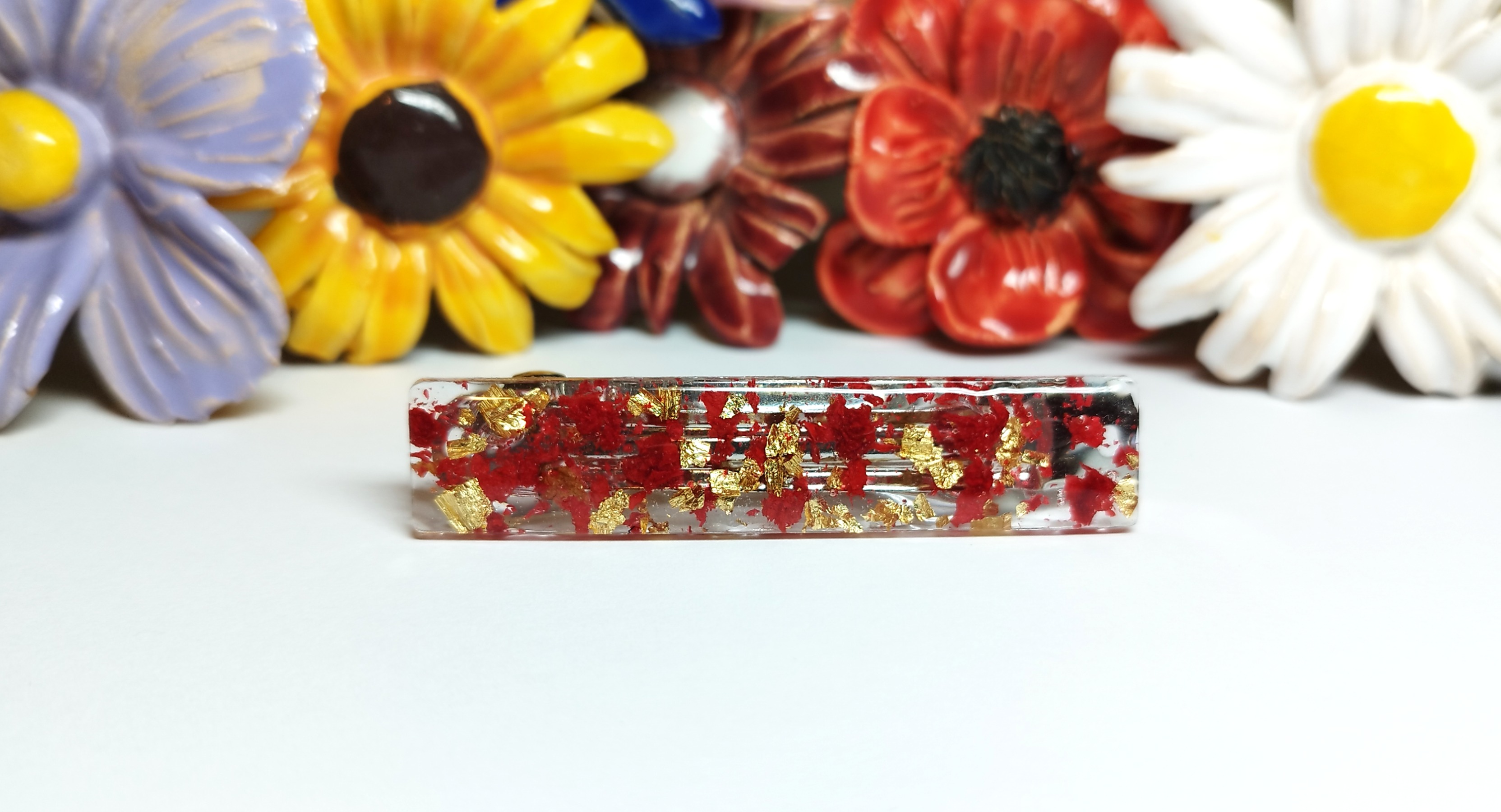 Okouzlující květinová spona do vlasů s pravými květy. Její propracovanost ihned upoutá Vaši pozornost. Skládá se ze sušených kousků květů granátového jablka a zlatých plátků, které jsou zalité v křišťálové pryskyřici. Francouzská spona do vlasů je ze slitiny oceli a její velikost je cca 8 cm. Nevhodné pro děti do 3 let nebo pod dohledem rodičů.