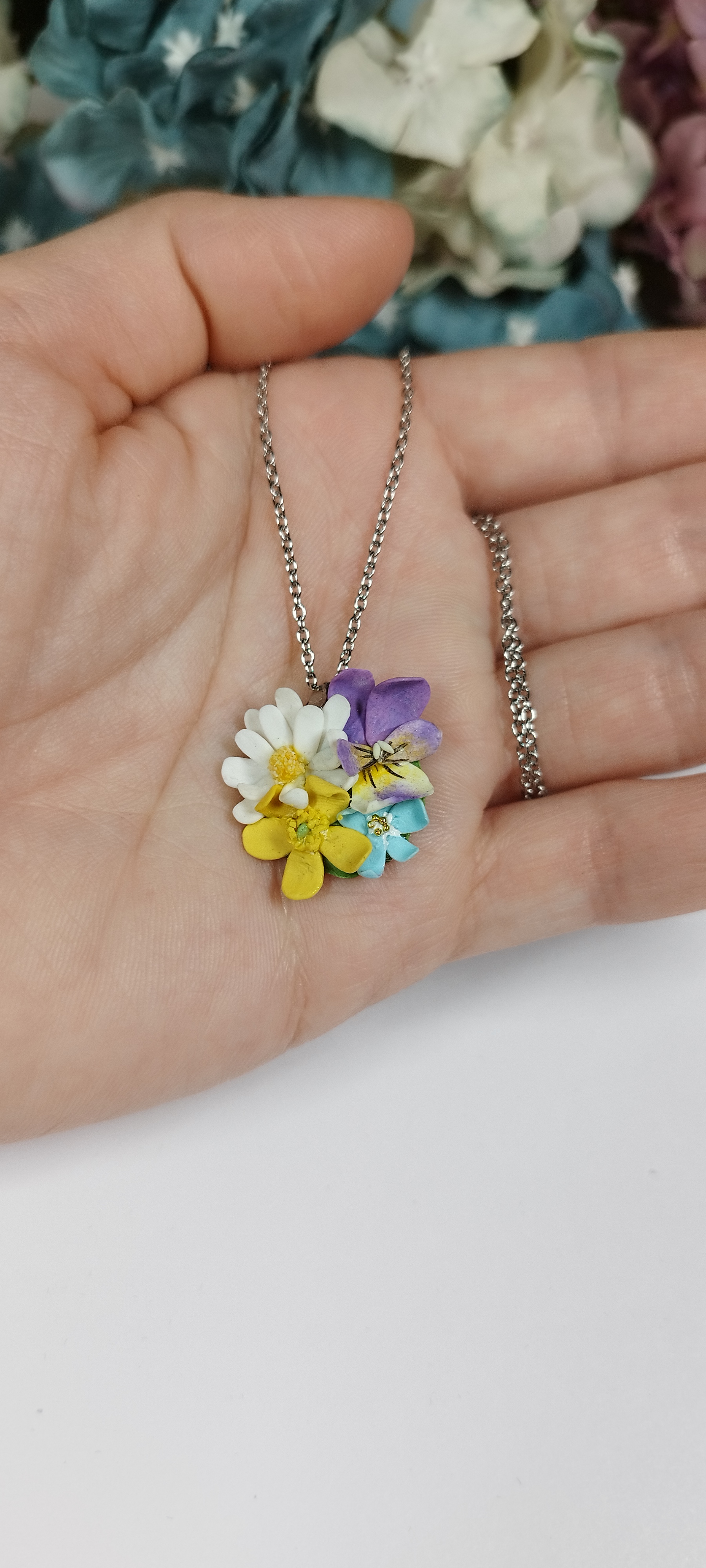 Výraznější barevný květinový náhrdelník, který se skládá z violky, sedmikrásky, pomněnky a pryskyřníku. Květy jsou vyrobené z polymerové hmoty a jejich celková velikost je cca 2 cm. Řetízek náhrdelníku je z chirurgické oceli. Květiny jsou přetřené křišťálovou pryskyřicí a speciálním lakem, díky čemuž zůstanou pevné. Nevhodné pro děti do 3 let nebo pod dohledem rodičů.