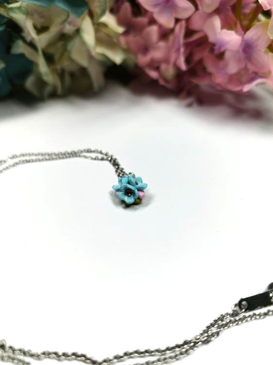 Květinový náhrdelník se třemi modrými pomněnkami. Řetízek náhrdelníku je z chirurgické oceli a jeho délka je cca 40 cm. Květy jsou vyrobené z polymerové hmoty, přičemž uvnitř každého z nich se ukrývá žlutý křišťál. Výrobek je přelakován speciálním pololesklým lakem, díky čemuž je pevný a odolný. Květiny jsou velké cca 1,3 cm. Nevhodné pro děti do 3 let nebo pod dohledem rodičů.