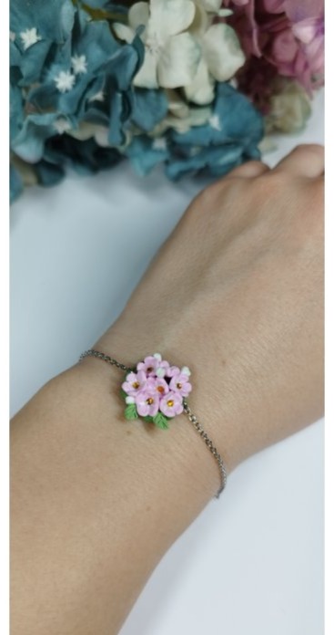 Květinový náramek se svazkem růžových pomněnkových kvítků. Jejich velikost je cca 2,5 cm. Květy jsou vyrobené z polymerové hmoty, přičemž uvnitř každého z nich se ukrývá žlutý křišťál. Výrobek je přelakován speciálním pololesklým lakem, díky čemuž je pevný a odolný. Řetízek náramku je z chirurgické oceli. Nevhodné pro děti do 3 let nebo pod dohledem rodičů.