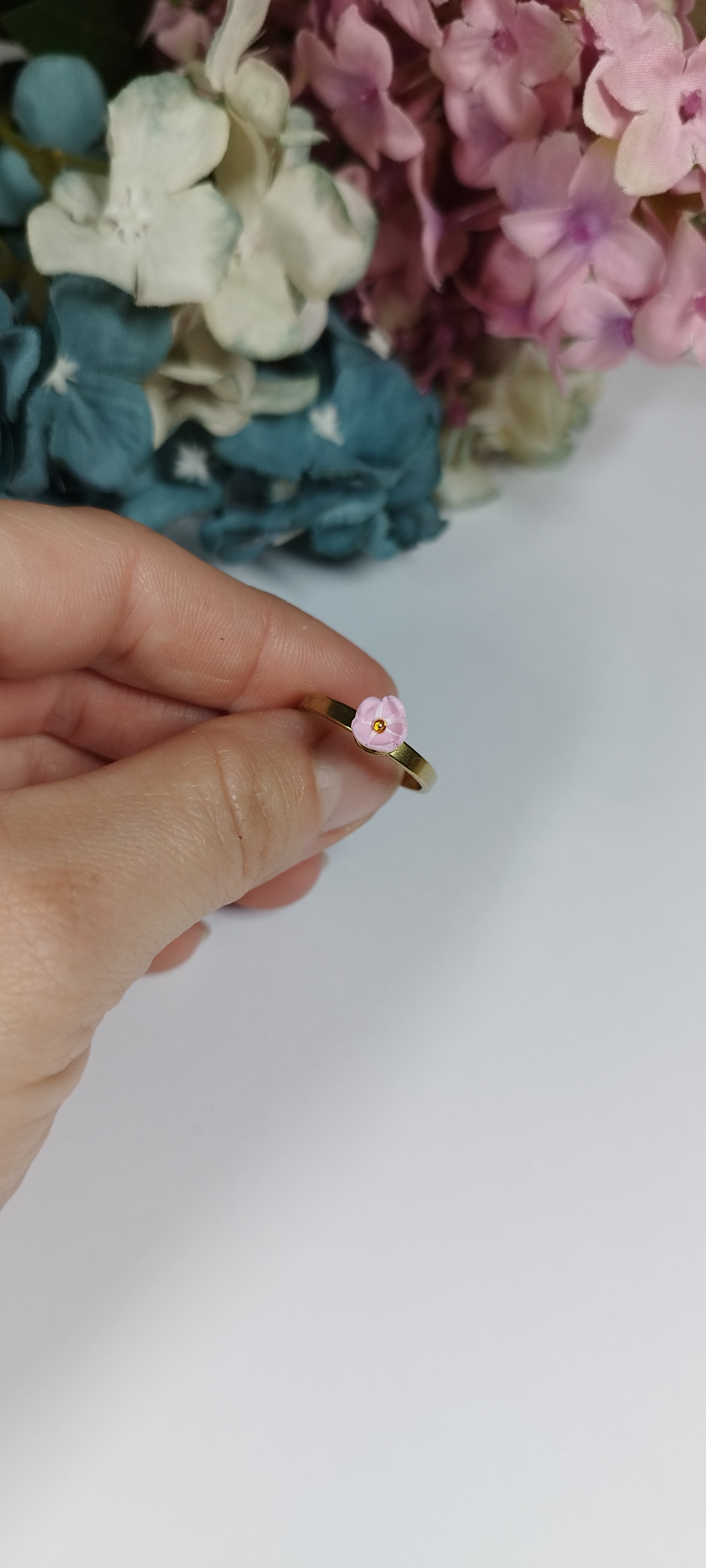 Květinový prsten s růžovým pomněnkovým květem. Jeho velikost je cca 1,3 cm. Prsten je nastavitelný, z nerezové oceli - pozlacený 24kt zlatem. Květ je vyrobený z polymerové hmoty a uvnitř něho se ukrývá žlutý křišťál. Výrobek je přelakován speciálním pololesklým lakem, díky čemuž je pevný a lesklý. Nevhodné pro děti do 3 let nebo pod dohledem rodičů.