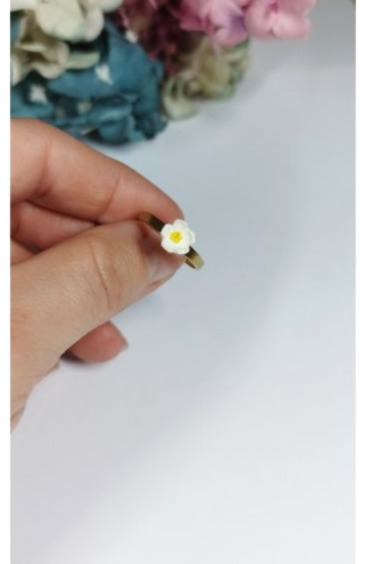 Květinový prsten s bílým pomněnkovým květem. Jeho velikost je cca 1,3 cm. Prsten je nastavitelný, z nerezové oceli - pozlacený 24kt zlatem. Květ je vyrobený z polymerové hmoty. Výrobek je přelakován speciálním pololesklým lakem, díky čemuž je pevný a odolný. Nevhodné pro děti do 3 let nebo pod dohledem rodičů.