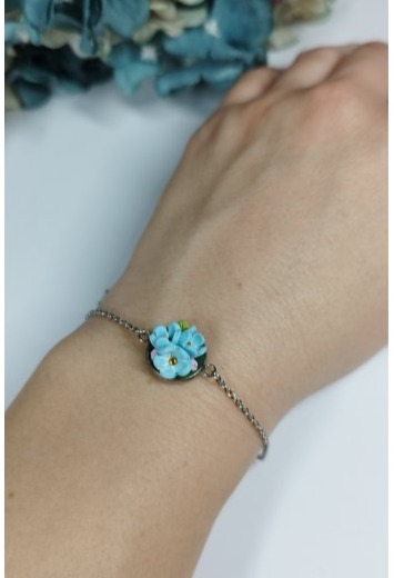 Květinový náramek se třemi pomněnkovými kvítky. Jejich velikost je cca 1,5 cm. Květy jsou vyrobené z polymerové hmoty, přičemž uvnitř každého z nich se ukrývá žlutý křišťál. Výrobek je přelakován speciálním pololesklým lakem, díky čemuž je pevný a odolný. Řetízek náramku je z chirurgické oceli. Nevhodné pro děti do 3 let nebo pod dohledem rodičů.