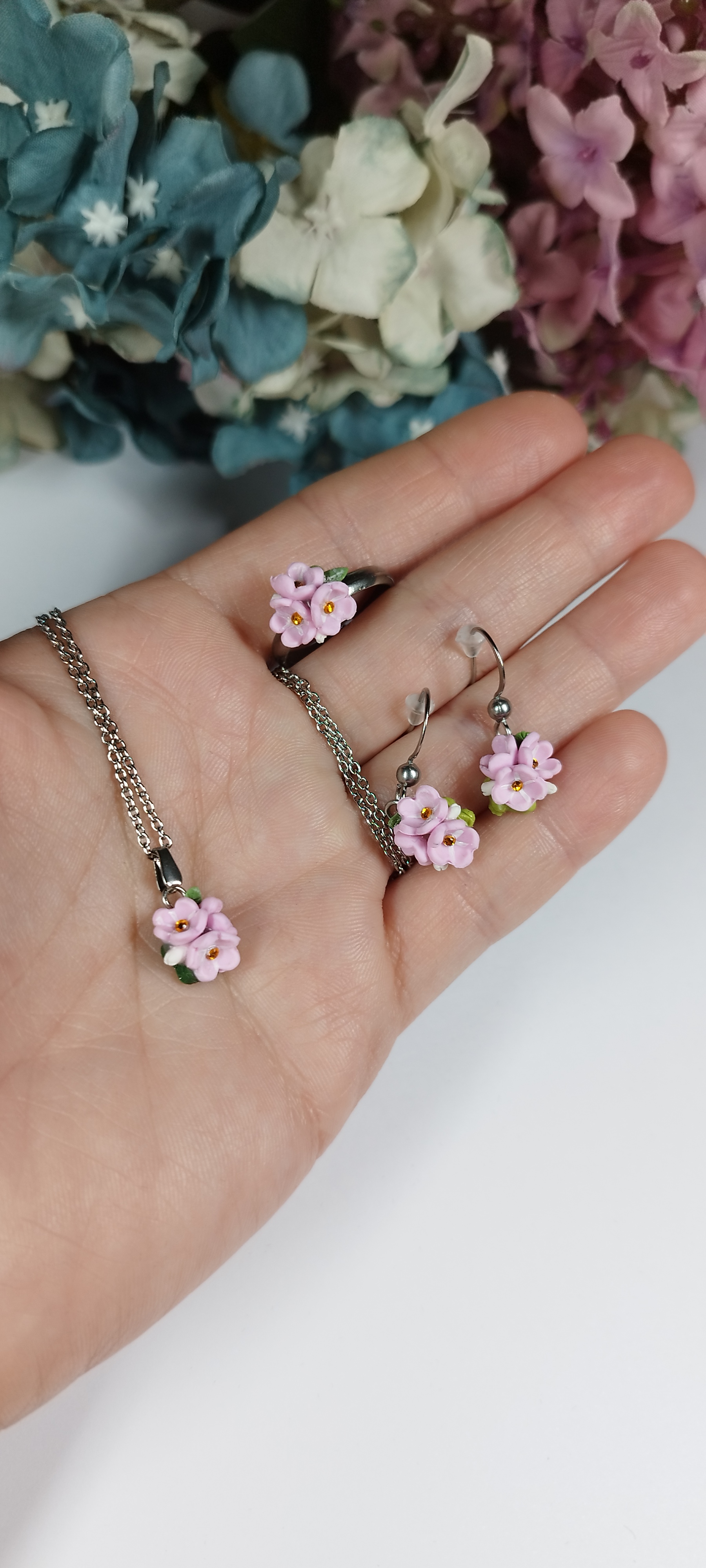 Sada růžových pomněnek, která obsahuje oblíbené produkty - visací náušnice, náhrdelník a prten. Kvítky jsou vyrobené z polymerové hmoty a umístěné na komponenty z chirurgické oceli. Květiny jsou přetřené křišťálovou pryskyřicí, díky čemuž jsou lesklé a pevné. Vše je zabaleno v dárkové krabičce. Nevhodné pro děti do 3 let nebo pod dohledem rodičů.