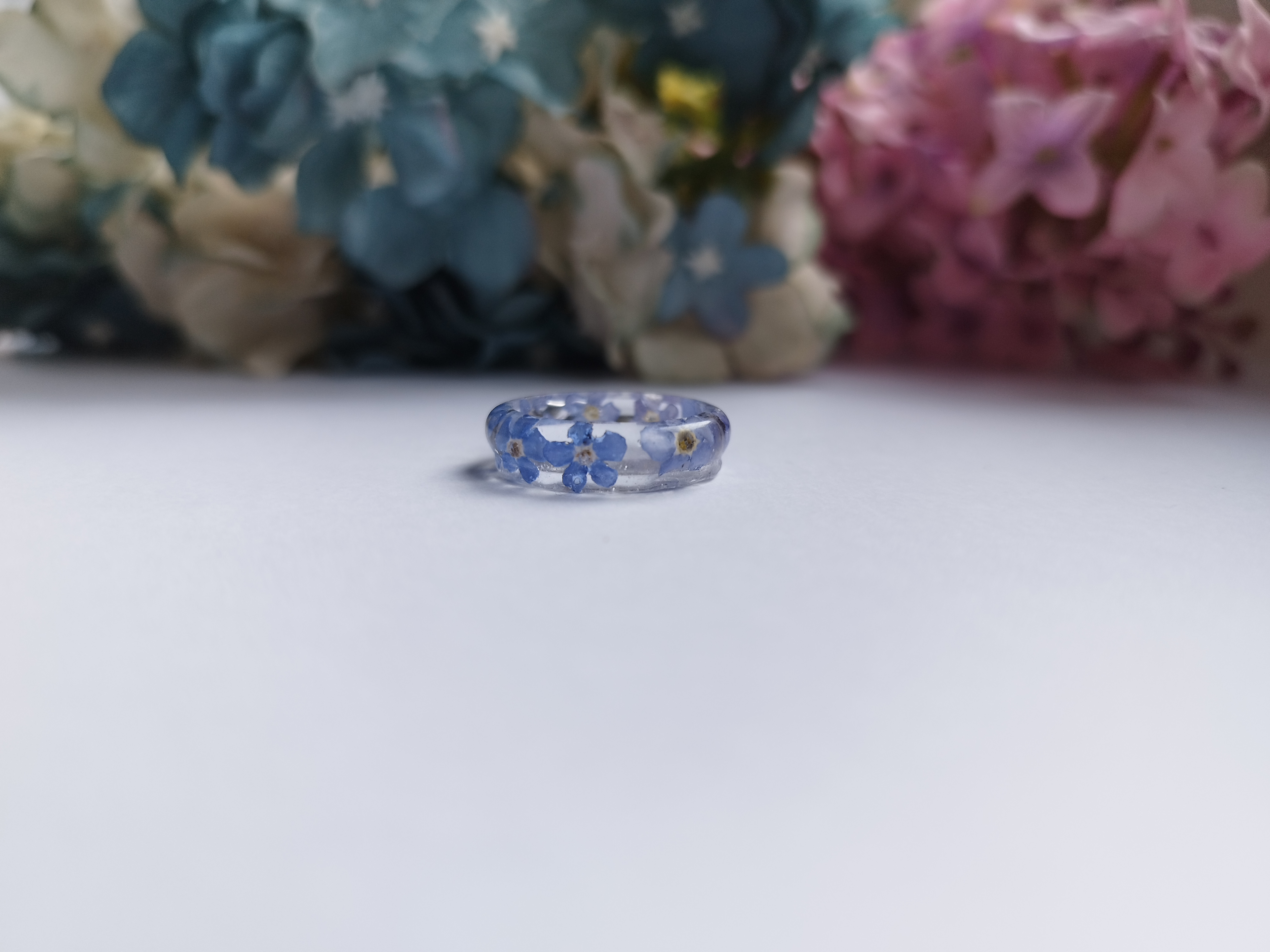 Úchvatný pomněnkový prsten vyrobený celý z křišťálové pryskyřice. Velikostí prstenu je několik, proto je nutné změřit si obcod prstu nebo průměr prstenu, který běžně nosíte. Nevhodné pro děti do 3 let nebo pod dohledem rodičů.