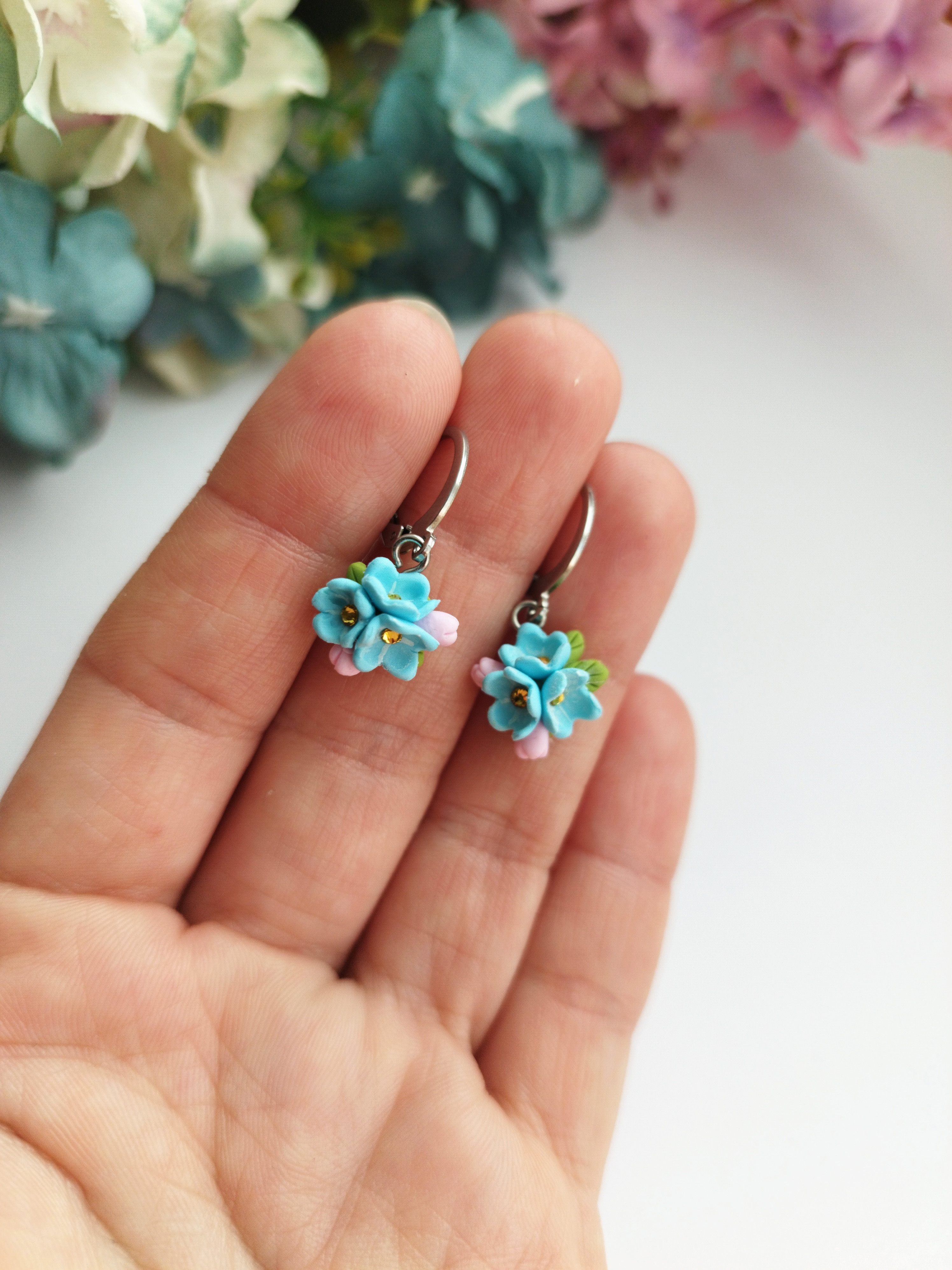 Pomněnková visací náušnice. Modré drobné kvítky jsou dozdobené žlutými křišťály Preciosa. Květina je vyrobená z polymerové hmoty a náušnice je z chirurgické oceli. Velikost náušnice je cca 1,2 cm. Nevhodné pro děti do 3 let nebo pod dohledem rodičů.
