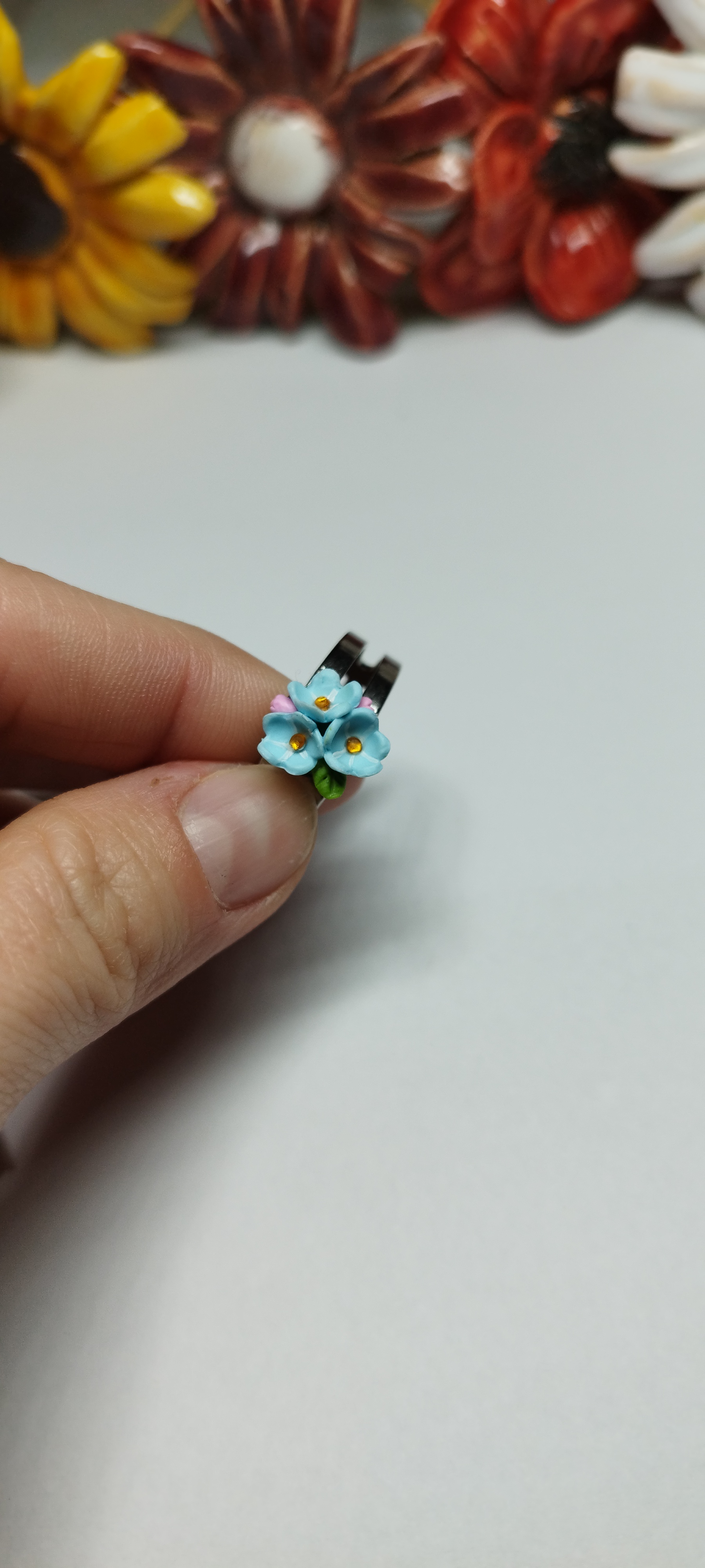Květinový prsten se třemi pomněnkovými kvítky. Jejich velikost je cca 1,3 cm. Prsten je nastavitelný, z chirurgické oceli. Květy jsou z polymerové hmoty, přičemž střed každého z nich zdobí žlutý křišťál. Výrobek je přelakován speciálním pololesklým lakem, díky čemuž je pevný a odolný. Nevhodné pro děti do 3 let nebo pod dohledem rodičů.