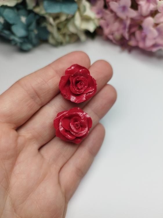 Elegantí červené náušnice růže, které jsou vhodným doplňkem každé ženy. Květy jsou propracovaně vyrobené z polymerové hmoty a přetřené speciálním lakem. Díky tomu jsou pevné a lesklé. Náušnice má velikost cca 2 cm a je na puzetě z chirurgické oceli. Nevhodné pro děti do 3 let nebo pod dohledem rodičů.