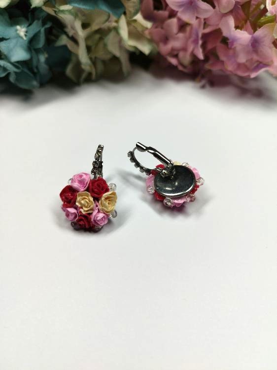 Elegantí růžičkové náušnice, které jsou vhodným doplňkem každé ženy. Květy jsou vyrobené z polymerové hmoty v barvách červené, krémové a růžové. Náušnice má velikost cca 2-2,5 cm a její zavírací zapínání z chirurgické oceli je posázené křišťály. Květy jsou přelakovány speciálním lakem, díky čemuž jsou odolnější. Nevhodné pro děti do 3 let nebo pod dohledem rodičů.