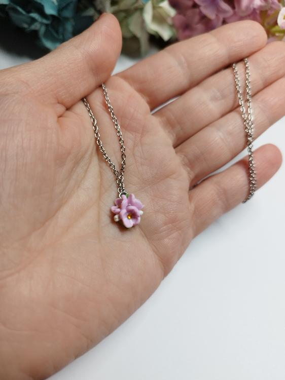 Květinový náhrdelník se třemi růžovými pomněnkami. Řetízek náhrdelníku je z chirurgické oceli a jeho délka je cca 40 cm. Květy jsou vyrobené z polymerové hmoty, přičemž uvnitř každého z nich se ukrývá žlutý křišťál. Výrobek je přelakován speciálním pololesklým lakem, díky čemuž je pevný a odolný. Květiny jsou velké cca 1,3 cm. Nevhodné pro děti do 3 let nebo pod dohledem rodičů.