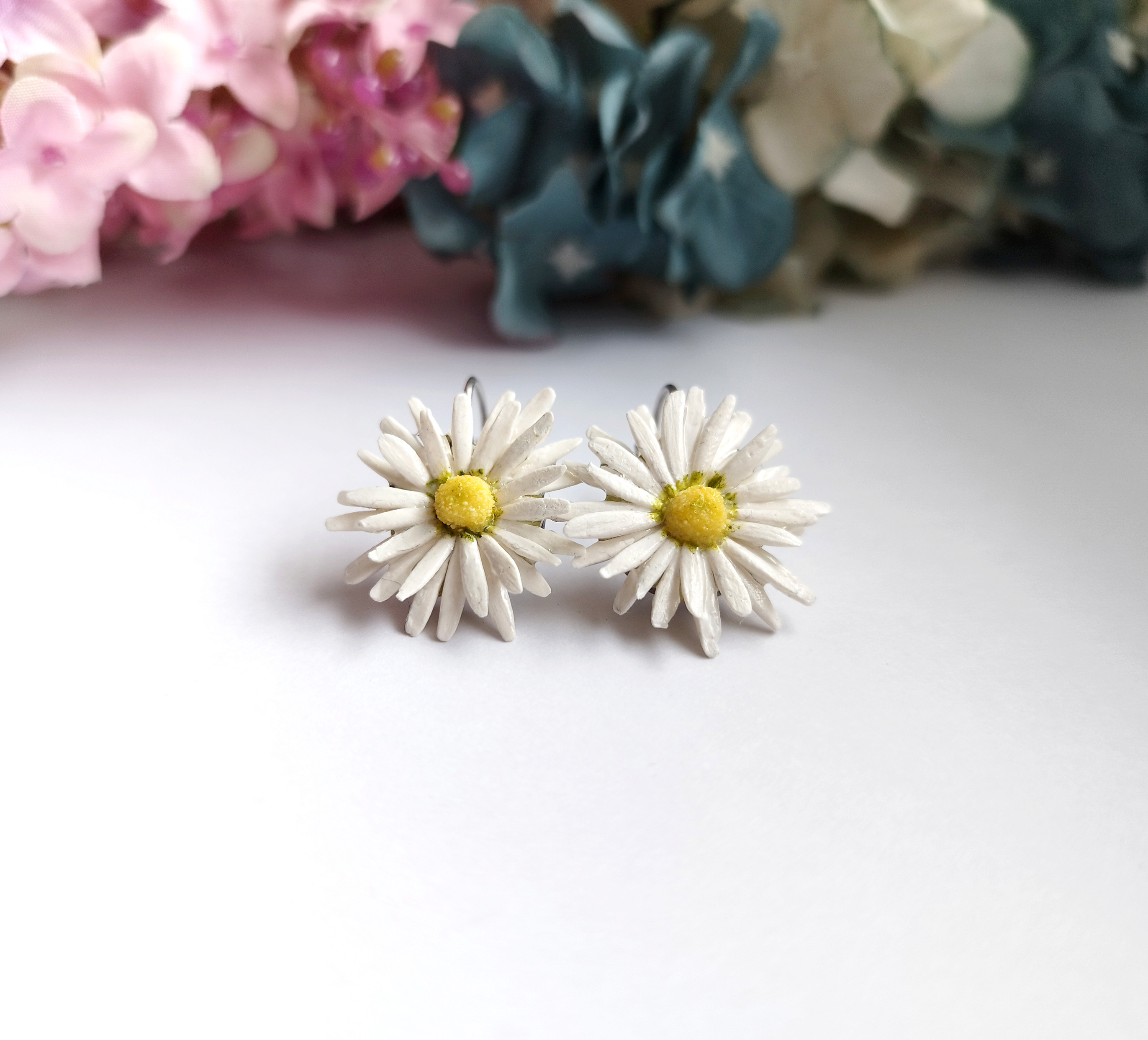 Visací náušnicový háček se sedmikráskou. Vypadá jako živá, ale nenechte se zmást! Je vyrobená z polymerové hmoty. Květina je přetřena speciálním lakem, díky tomu je květ pevný a lesklý. Velikost náušnice je cca 2 cm. Nevhodné pro děti do 3 let nebo pod dohledem rodičů.