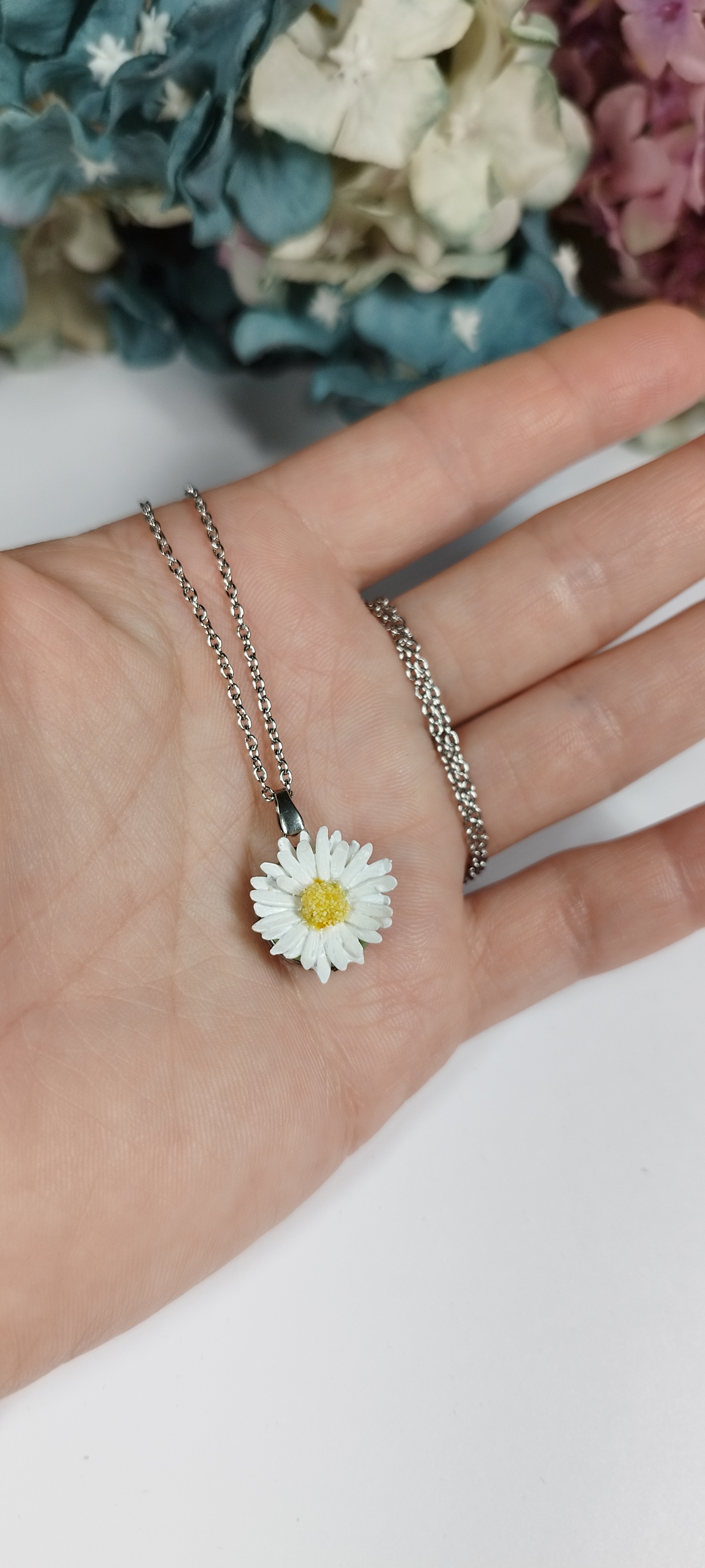 Náhrdelník s klasickou bílou sedmikráskou. Květ je více propracovanější, aby byl podobnější skutečné sedmikrásce. Jeho velikost je cca 2 cm. Květina je vyrobena z polymerové hmoty a přetřená křišťálovou pryskyřicí. Díky tomu je pevná a lesklá.Řetízek je z chirurgické oceli. Nevhodné pro děti do 3 let nebo pod dohledem rodičů.