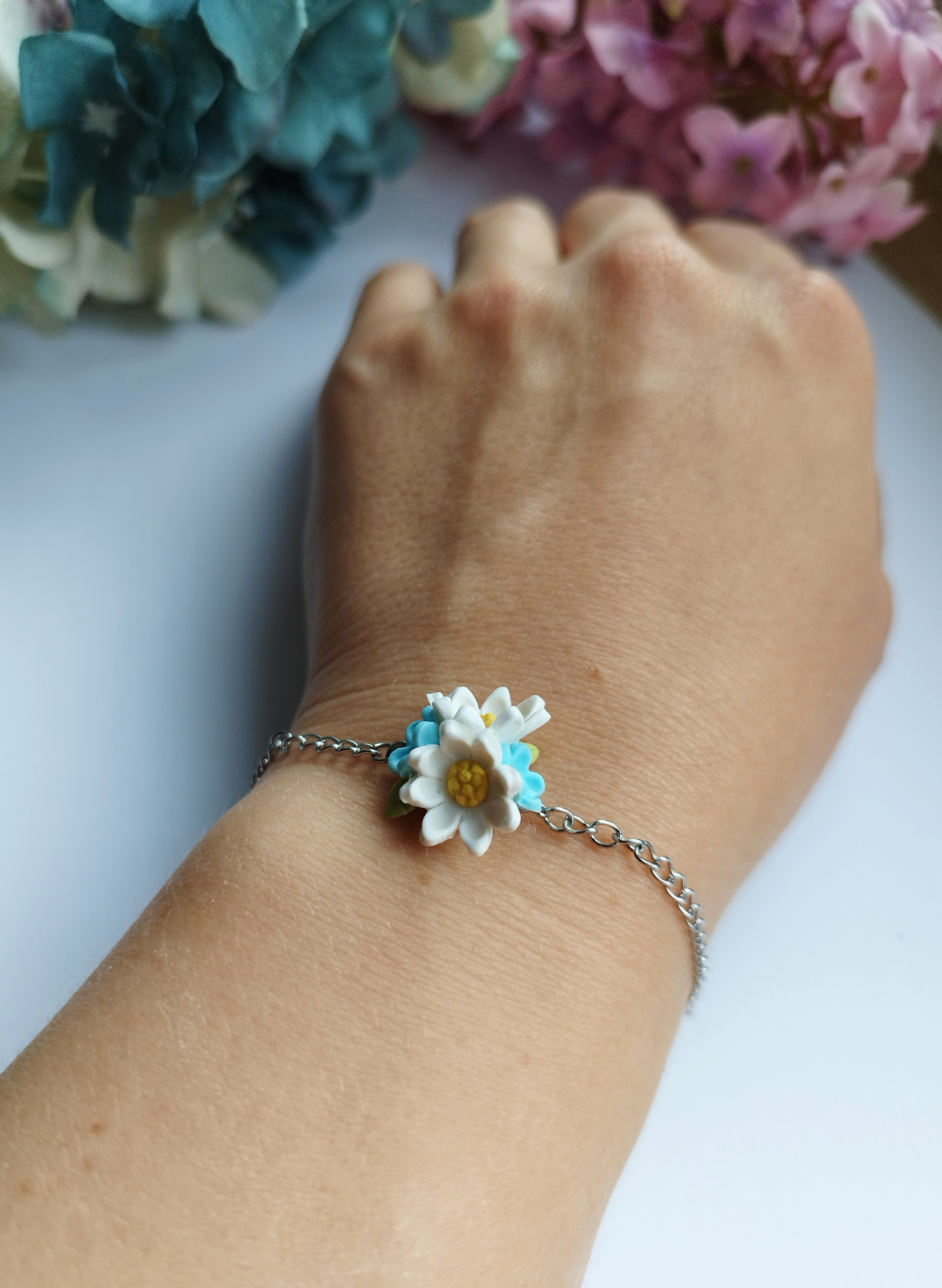 Jemný a přesto výrazný květinový náramek, který se skládá ze sedmikrásek a pomněnek. Květy jsou vytvořené z polymerové hmoty a přetřeny speciálním lakem. Náramek je vyroben z chirurgické oceli (316L). Jeho délka je cca 18 cm. Očka jsou větší, takže lze zapnout kdekoliv je třeba. Nevhodné pro děti do 3 let nebo pod dohledem rodičů.