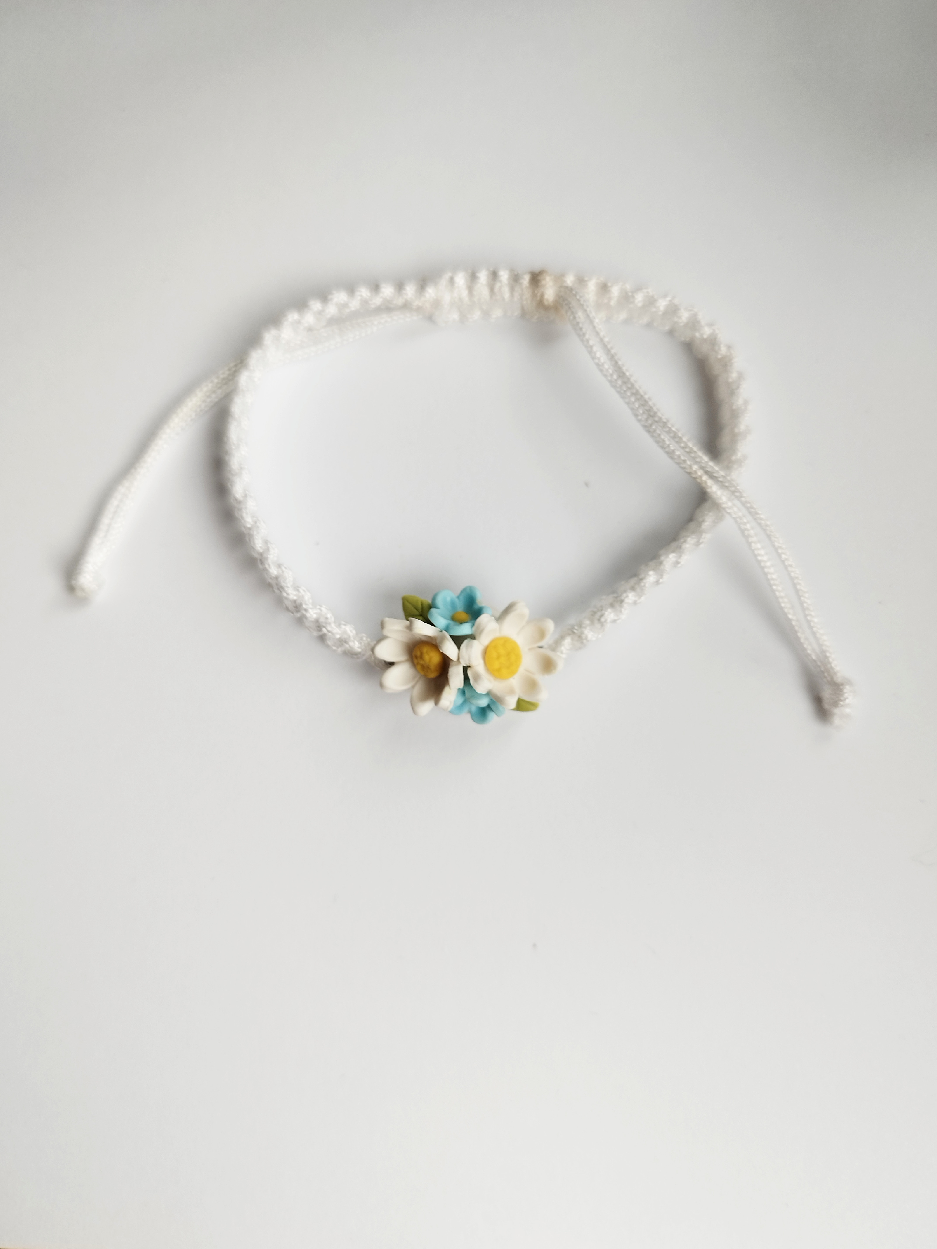 Jemný a přesto výrazný květinový náramek, který se skládá ze sedmikrásky a pomněnek. Květy jsou vytvořené z polymerové hmoty a přetřeny speciálním lakem. Kroužky jsou vyrobené z chirurgické oceli. Shamballa náramek - zavazování pomocí šňůrek. Nevhodné pro děti do 3 let nebo pod dohledem rodičů.
