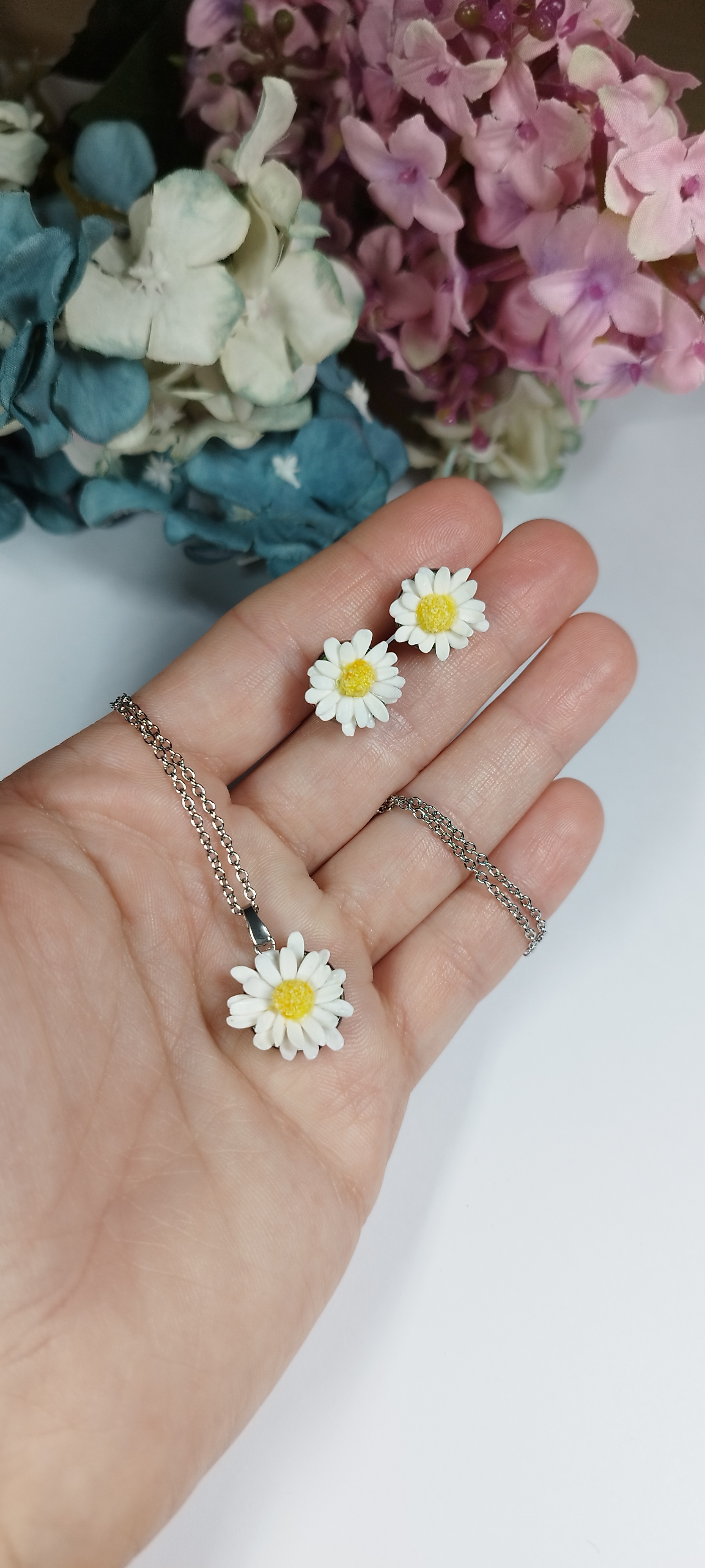 Sada sedmikrásek, která obsahuje oblíbené produkty - visací náušnice a náhrdelník. Květy jsou vyrobené z polymerové hmoty a umístěné na komponenty z chirurgické oceli. Květiny jsou přetřené křišťálovou pryskyřicí, díky čemuž jsou lesklé a pevné. Vše je zabaleno v dárkové krabičce. Nevhodné pro děti do 3 let nebo pod dohledem rodičů.