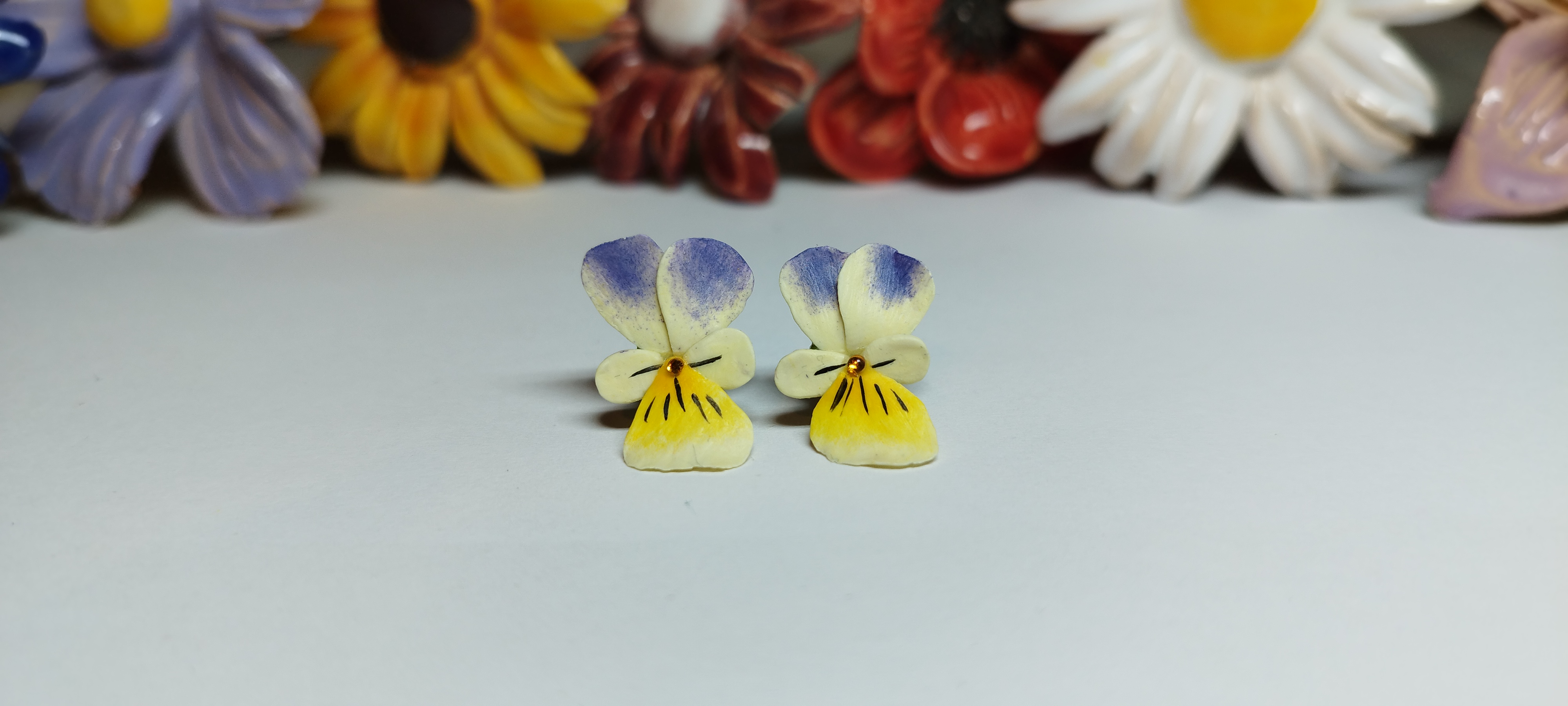 Violka s jemně žlutým zabarvením, výrazným fialovým vrškem a křišťálem uprostřed. Vypadá jako živá, ale nenechte se zmást! Květina je vyrobená z polymerové hmoty a přetřená speciálním lakem. Díky tomu je květ pevný. Violka je na puzetě z chirurgické oceli. Velikost květiny je cca 1,8 cm. Nevhodné pro děti do 3 let nebo pod dohledem rodičů.