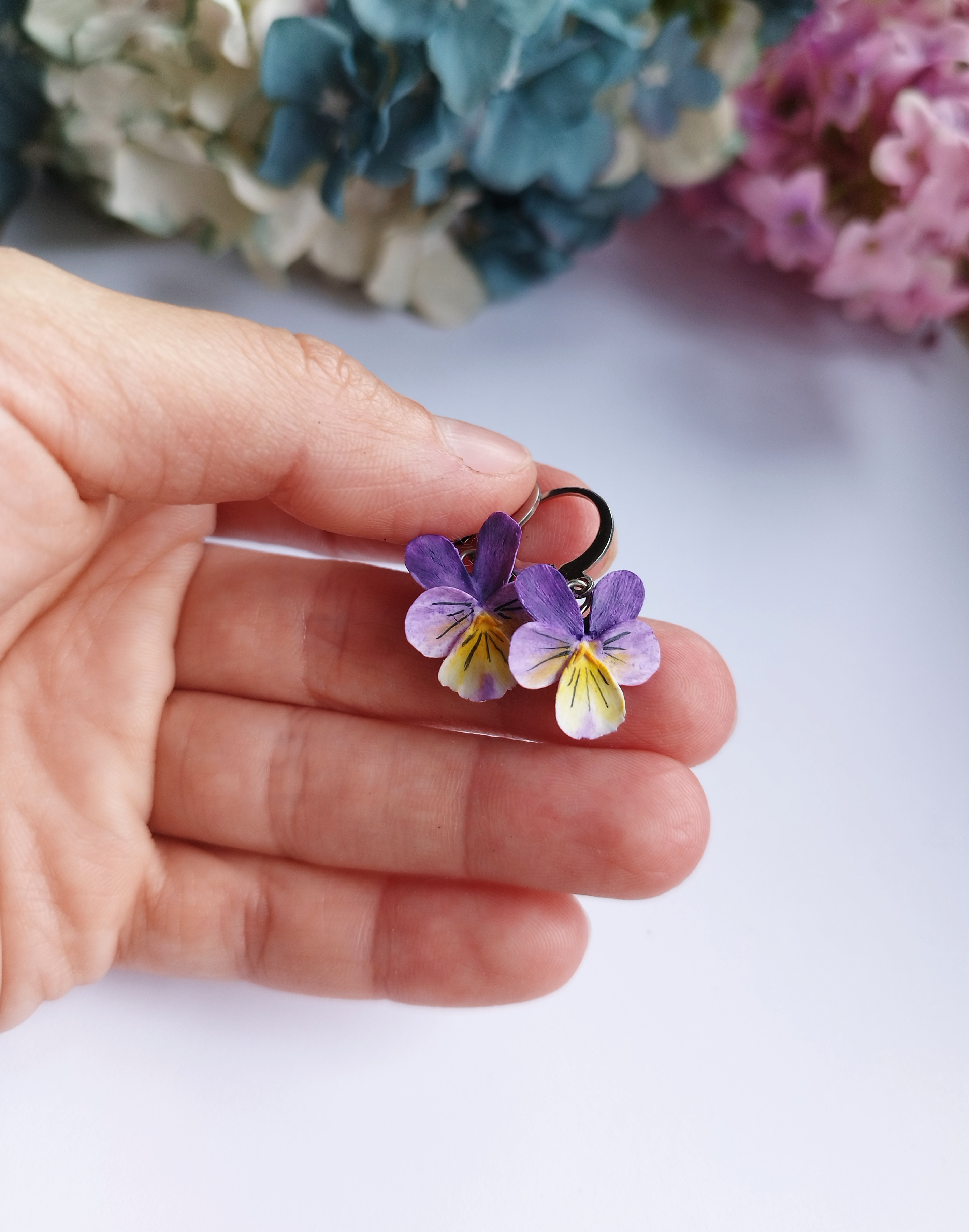 Violka s modro-fialovým zabarvením na visací náušnici z chirurgické oceli. Vypadá jako živá, ale nenechte se zmást! Květina je vyrobená z polymerové hmoty. Violka je přetřená speciálním lakem a křišťálovou pryskyřicí. Díky tomu je květ pevný. Velikost náušnice je cca 1,8 cm. Nevhodné pro děti do 3 let nebo pod dohledem rodičů.
