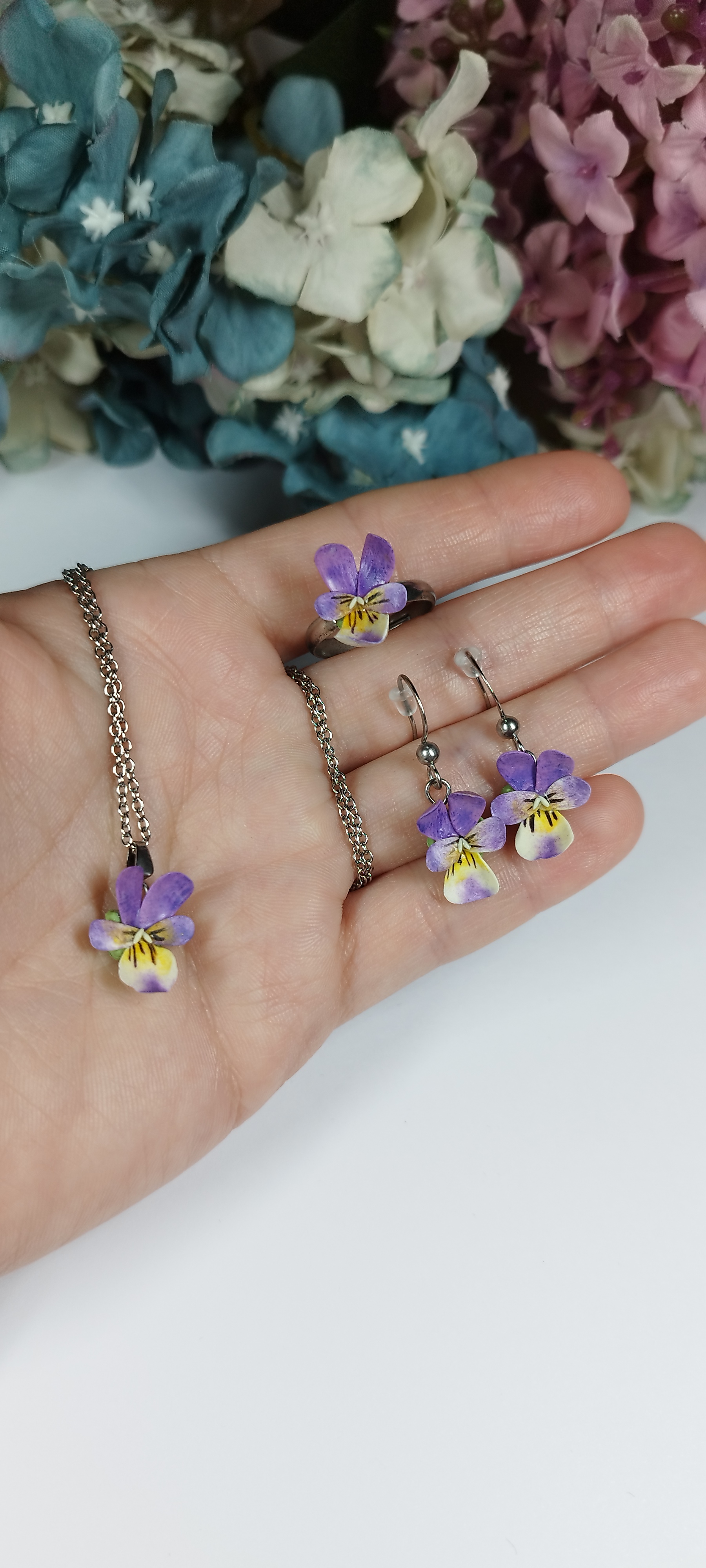 Sada modrých violek, která obsahuje oblíbené produkty - visací náušnice, náhrdelník a prten. Květy jsou vyrobené z polymerové hmoty a umístěné na komponenty z chirurgické oceli. Květiny jsou přetřené křišťálovou pryskyřicí, díky čemuž jsou lesklé a pevné. Vše je zabaleno v dárkové krabičce. Nevhodné pro děti do 3 let nebo pod dohledem rodičů.