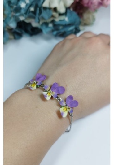 Květinový náramek se třemi modrými violkami. Květy jsou vyrobené z polymerové hmoty a přetřené speciálním lakem, díky čemuž jsou pevné a odolné. Řetízek náramku je z chirurgické oceli. Jednotlivé květy jsou velké cca 1,8 cm. Nevhodné pro děti do 3 let nebo pod dohledem rodičů.