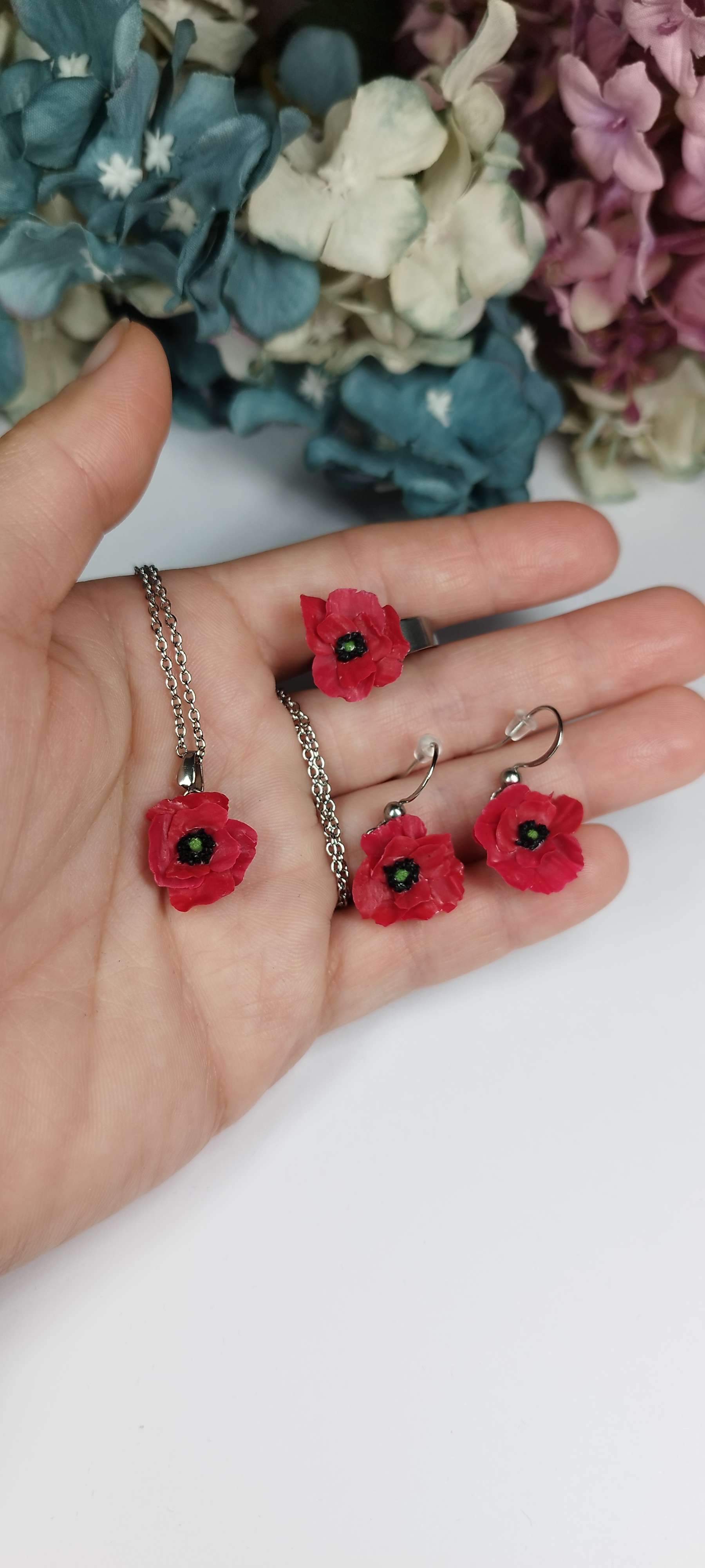 Květinová sada vlčích máků, která obsahuje oblíbené produkty - visací náušnice, náhrdelník a prsten. Svým propracovaným provedením se snaží originálně napadobit pravé květiny. Květy jsou vyrobené z polymerové hmoty a přidělané na komponenty z chirurgické oceli. Velikost vlčího máku je cca 1,5 cm. Květiny jsou přetřené křišťálovou pryskyřicí, díky čemuž jsou lesklé a pevné. Vše je zabaleno v dárkové krabičce. Nevhodné pro děti do 3 let nebo pod dohledem rodičů.