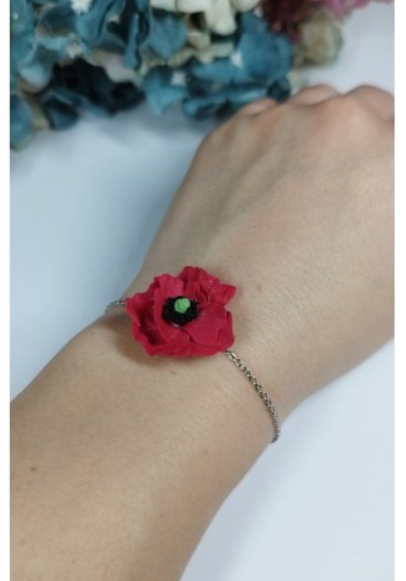 Krásný náramek s květem vlčího máku okouzlí svým jedinečným zpracováním opravdu každého. Propracovaným provedením z polymerové hmoty se snaží originálně napadobit pravou květinu. Náramek je z chirurgické oceli. Květ je velký cca 2,5 cm. Vlčí mák je přetřen křišťálovou pryskyřicí a speciálním lakem, díky čemuž zůstane pevný. Nevhodné pro děti do 3 let nebo pod dohledem rodičů.