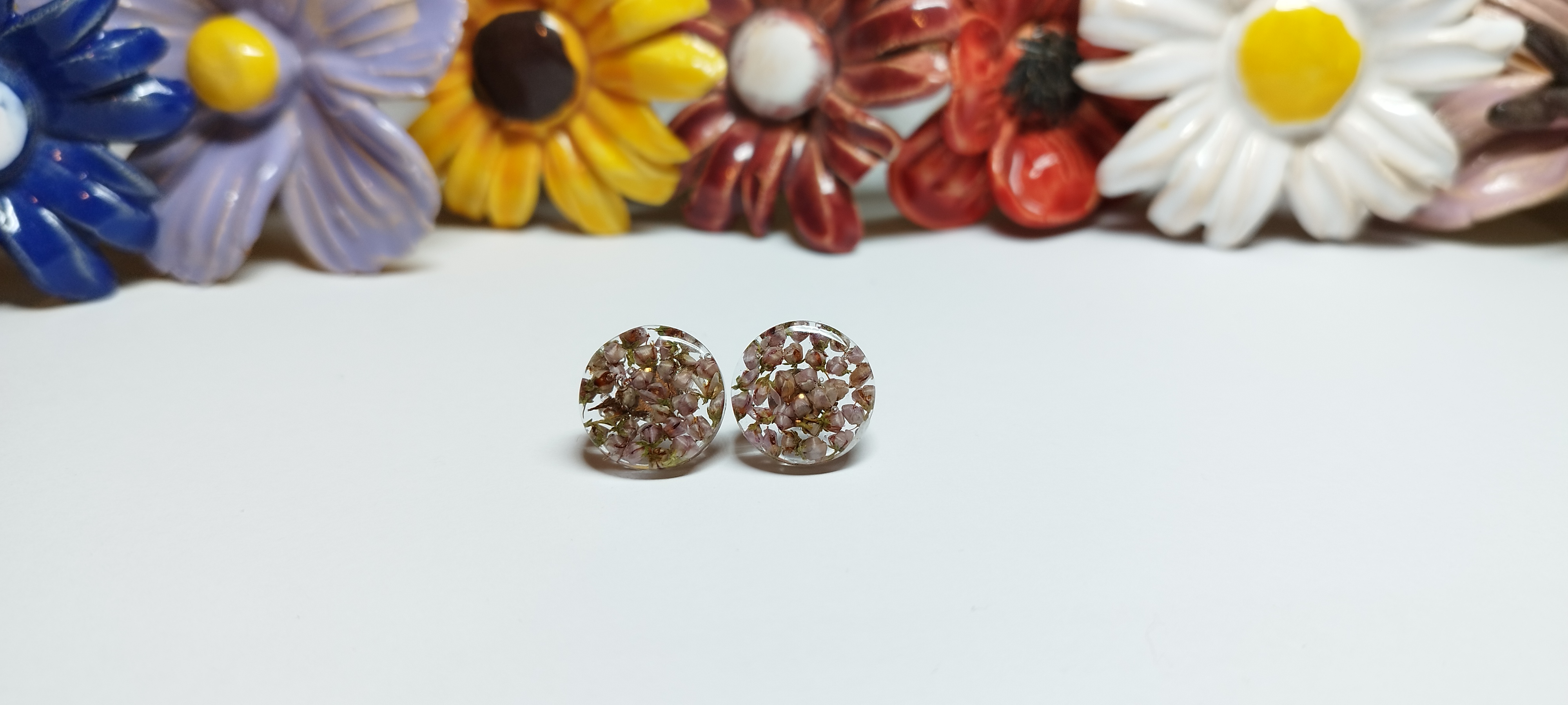 Naušnice s kousky růžového vřesu zalitého v křišťálové pryskyřici. Kulatá náušnice je na puzetě z chirurgické oceli a je velká cca 1,5 cm. Nevhodné pro děti do 3 let nebo pod dohledem rodičů.